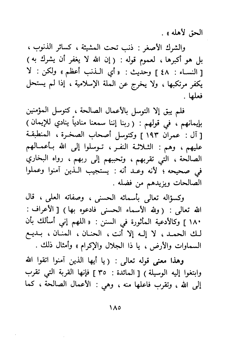 وهذا معنى قوله تعالى: {يَا أَيُّهَا الَّذِينَ آمَنُوا اتَّقُوا اللَّهَ وَابْتَغُوا إِلَيْهِ الْوَسِيلَةَ} [سورة المائدة آية: 35] ، فإنها القربة التي تقرب إلى الله، وتقرب فاعلها منه، وهي: الأعمال الصالحة، كما