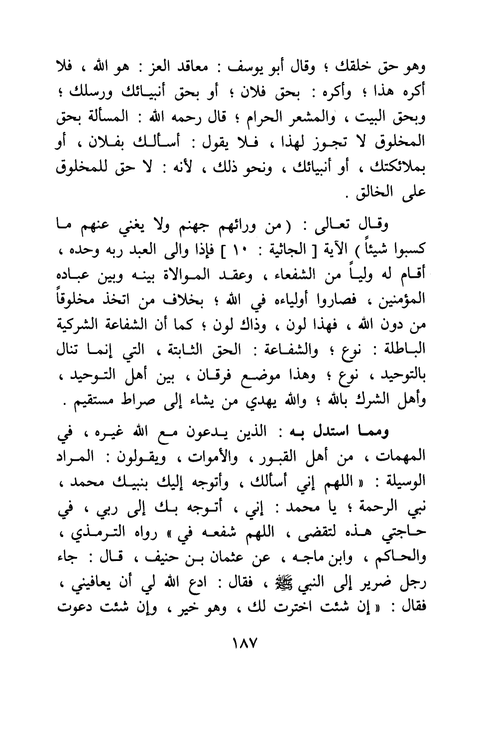ومما استدل به الذين يدعون مع الله غيره، في المهمات من أهل القبور والأموات، ويقولون: المراد الوسيلة: " اللهم إني أسألك، وأتوجه إليك بنبيك محمد، نبي الرحمة; يا محمد إني، أتوجه بك إلى ربي، في حاجتي هذه لتقضى، اللهم شفعه في " 1 رواه الترمذي، والحاكم، وابن ماجه، عن عثمان بن حنيف، قال: " جاء رجل ضرير إلى النبي، فقال: ادع الله لي أن يعافيني، فقال: إن شئت اخترت لك، وهو خير، وإن شئت دعوت