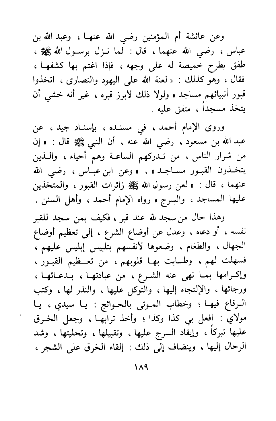 وروى الإمام أحمد في مسنده، بإسناد جيد، عن عبد الله بن مسعود، (أن النبي قال: "إن من شرار الناس، من تدركهم الساعة وهم أحياء، والذين يتخذون القبور مساجد " 2 وعن ابن عباس، رضي الله عنهما; قال: " لعن رسول الله زائرات القبور، والمتخذين عليها المساجد، والسرج" 3 رواه الإمام أحمد، وأهل السنن.