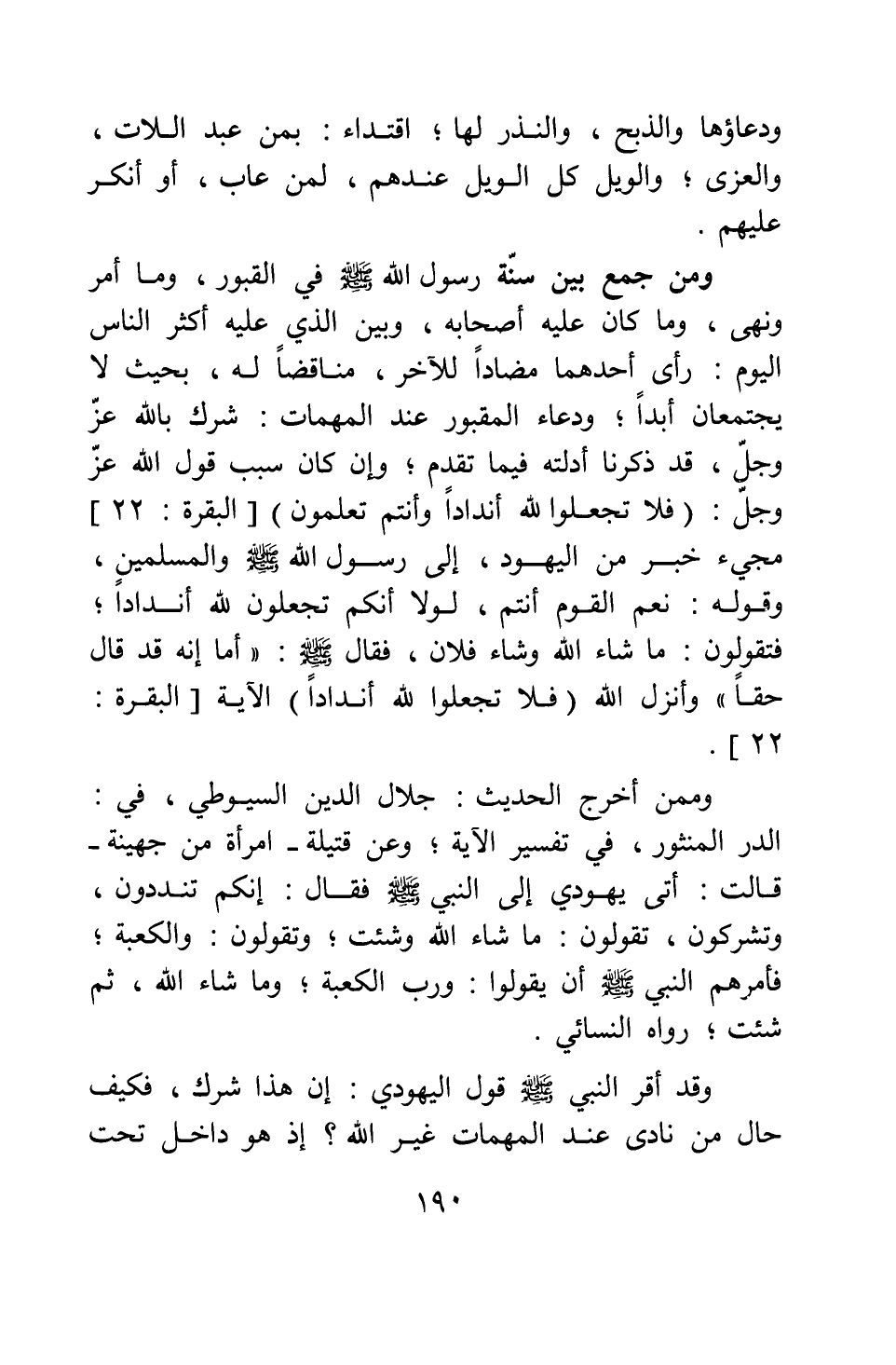ومن جمع بين سنة رسول الله (في القبور، وما أمر ونهى، وما كان عليه أصحابه، وبين الذي عليه أكثر الناس اليوم رأى أحدهما مضادا للآخر، مناقضا له، بحيث لا يجتمعان أبدا; ودعاء المقبور عند المهمات شرك بالله (، قد ذكرنا أدلته فيما تقدم; وإن كان سبب قول الله {فَلا تَجْعَلُوا لِلَّهِ أَنْدَاداً وَأَنْتُمْ تَعْلَمُونَ} [سورة البقرة آية: 22] ، مجيء خبر من اليهود، إلى رسول الله (والمسلمين، وقوله: "نعم القوم أنتم، لولا أنكم تجعلون لله أندادا; فتقولون: ما شاء الله وشاء فلان، فقال أما إنه قد قال حقا " 1، وأنزل الله {فَلا تَجْعَلُوا لِلَّهِ أَنْدَاداً} الآية [سورة البقرة آية: 22] .