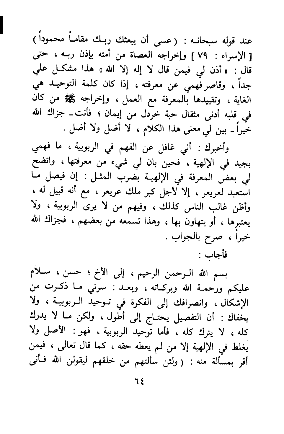 سرني ما ذكرت من الإشكال، وانصرافك إلى الفكرة في توحيد الربوبية، ولا يخفاك أن التفصيل يحتاج إلى أطول، ولكن ما لا يدرك كله، لا يترك كله. فأما توحيد الربوبية، فهو: الأصل، ولا يغلط في الإلهية إلا من لم يعطه حقه، كما قال تعالى فيمن أقر بمسألة منه: {وَلَئِنْ سَأَلْتَهُمْ مَنْ خَلَقَهُمْ لَيَقُولُنَّ اللَّهُ فَأَنَّى