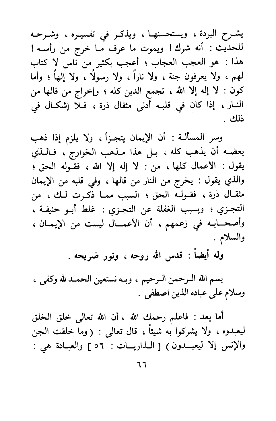 يشرح البردة، ويستحسنها، ويذكر في تفسيره وشرحه للحديث أنه شرك! ويموت ما عرف ما خرج من رأسه! هذا هو العجب العجاب، أعجب بكثير من ناس لا كتاب لهم، ولا يعرفون جنة، ولا نارا، ولا رسولا، ولا إلها; وأما كون لا إله إلا الله، تجمع الدين كله، وإخراج من قالها من النار، إذا كان في قلبه أدنى مثقال ذرة، فلا إشكال في ذلك.
