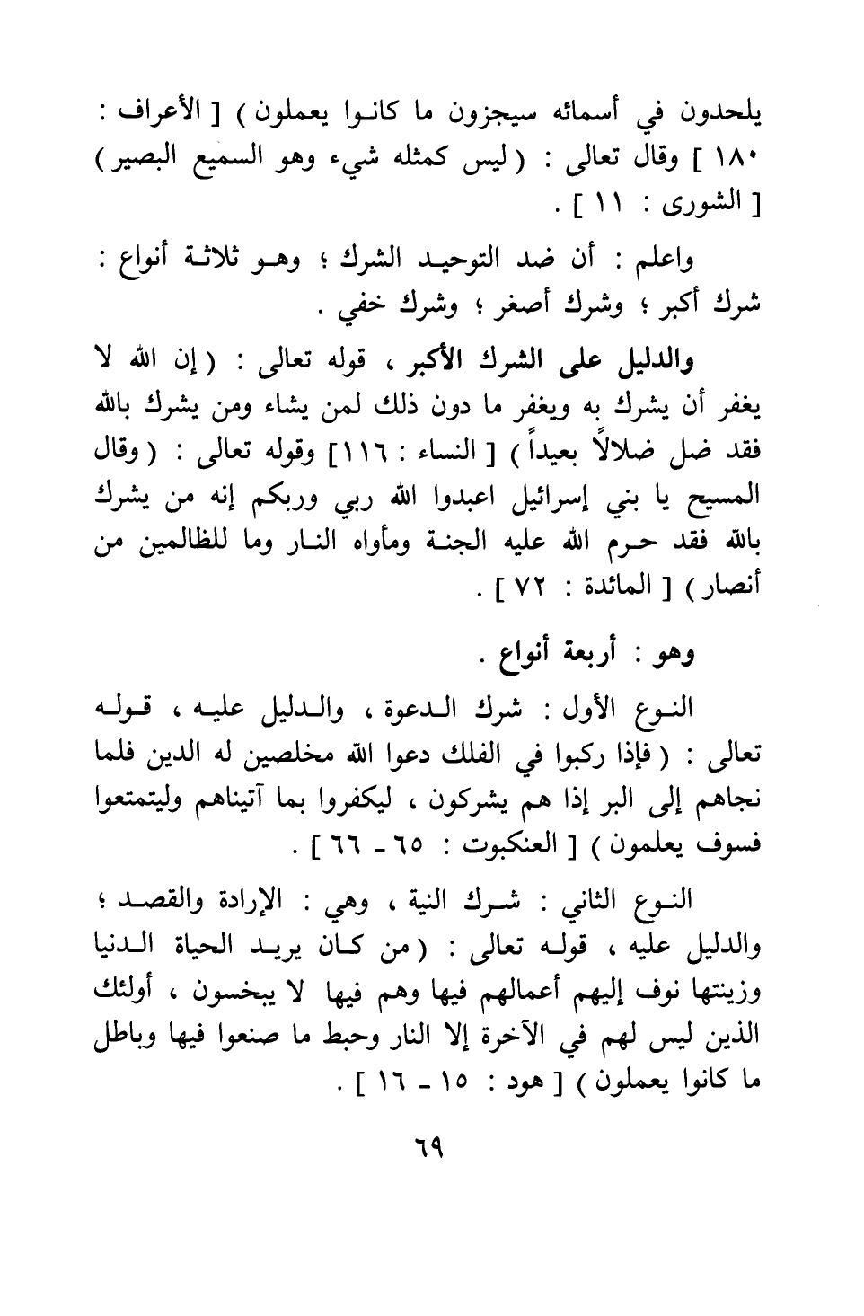 النوع الثاني: شرك النية، وهي: الإرادة والقصد; والدليل عليه، قوله تعالى: {مَنْ كَانَ يُرِيدُ الْحَيَاةَ الدُّنْيَا وَزِينَتَهَا نُوَفِّ إِلَيْهِمْ أَعْمَالَهُمْ فِيهَا وَهُمْ فِيهَا لا يُبْخَسُونَ أُولَئِكَ الَّذِينَ لَيْسَ لَهُمْ فِي الْآخِرَةِ إِلَّا النَّارُ وَحَبِطَ مَا صَنَعُوا فِيهَا وَبَاطِلٌ مَا كَانُوا يَعْمَلُونَ} [سورة هود آية: 15"16] .