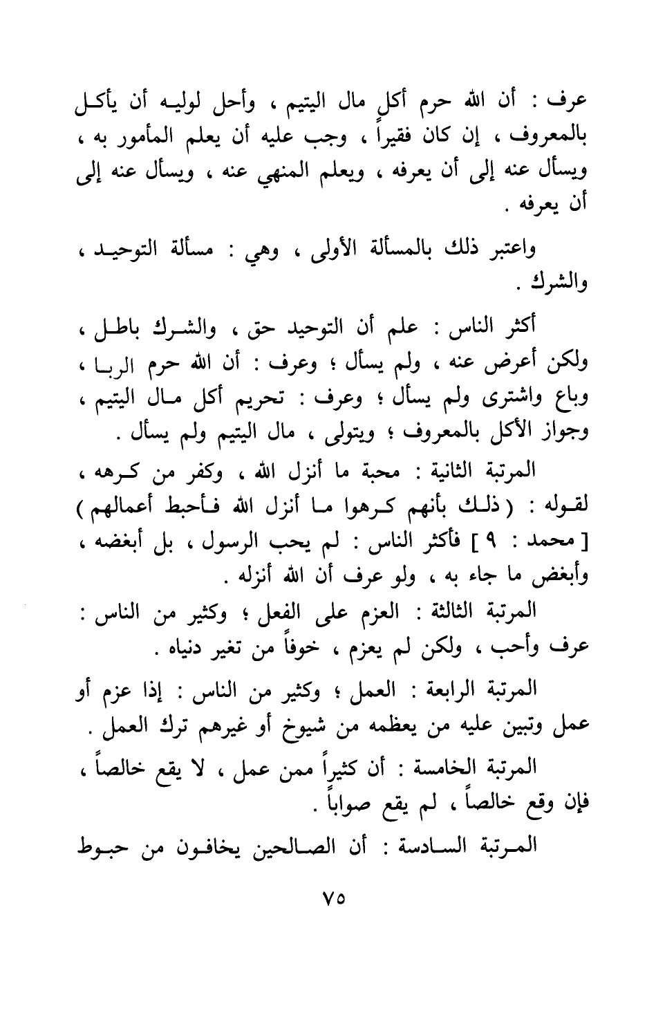 أكثر الناس علم أن التوحيد حق، والشرك باطل، ولكن أعرض عنه ولم يسأل، وعرف أن الله حرم الربا، وباع واشترى ولم يسأل، وعرف تحريم أكل مال اليتيم، وجواز الأكل بالمعروف، ويتولى، مال اليتيم ولم يسأل.