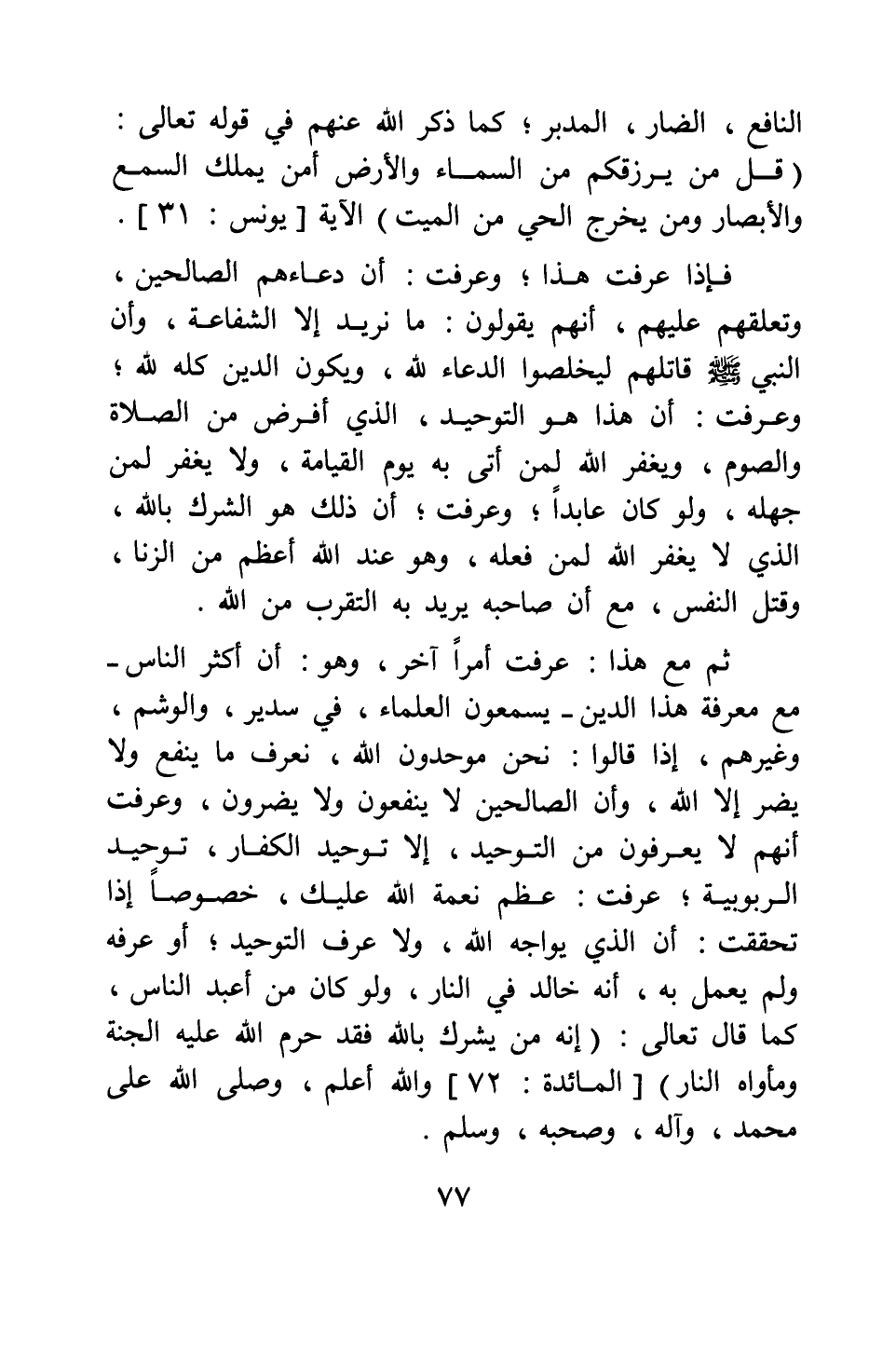 ثم مع هذا عرفت أمرا آخر، وهو أن أكثر الناس" مع معرفة هذا الدين" يسمعون العلماء في سدير، والوشم، وغيرهم، إذا قالوا: نحن موحدون الله، نعرف ما ينفع ولا يضر إلا الله، وأن الصالحين لا ينفعون ولا يضرون، وعرفت أنهم لا يعرفون من التوحيد إلا توحيد الكفار، توحيد الربوبية، عرفت عظم نعمة الله عليك، خصوصا إذا تحققت أن الذي يواجه الله، ولا عرف التوحيد، أو عرفه ولم يعمل به، أنه خالد في النار، ولو كان من أعبد الناس، كما قال تعالى: {إِنَّهُ مَنْ يُشْرِكْ بِاللَّهِ فَقَدْ حَرَّمَ اللَّهُ عَلَيْهِ الْجَنَّةَ وَمَأْوَاهُ النَّارُ} [سورة المائدة آية: 72] . والله أعلم، وصلى الله على محمد وآله وصحبه وسلم.