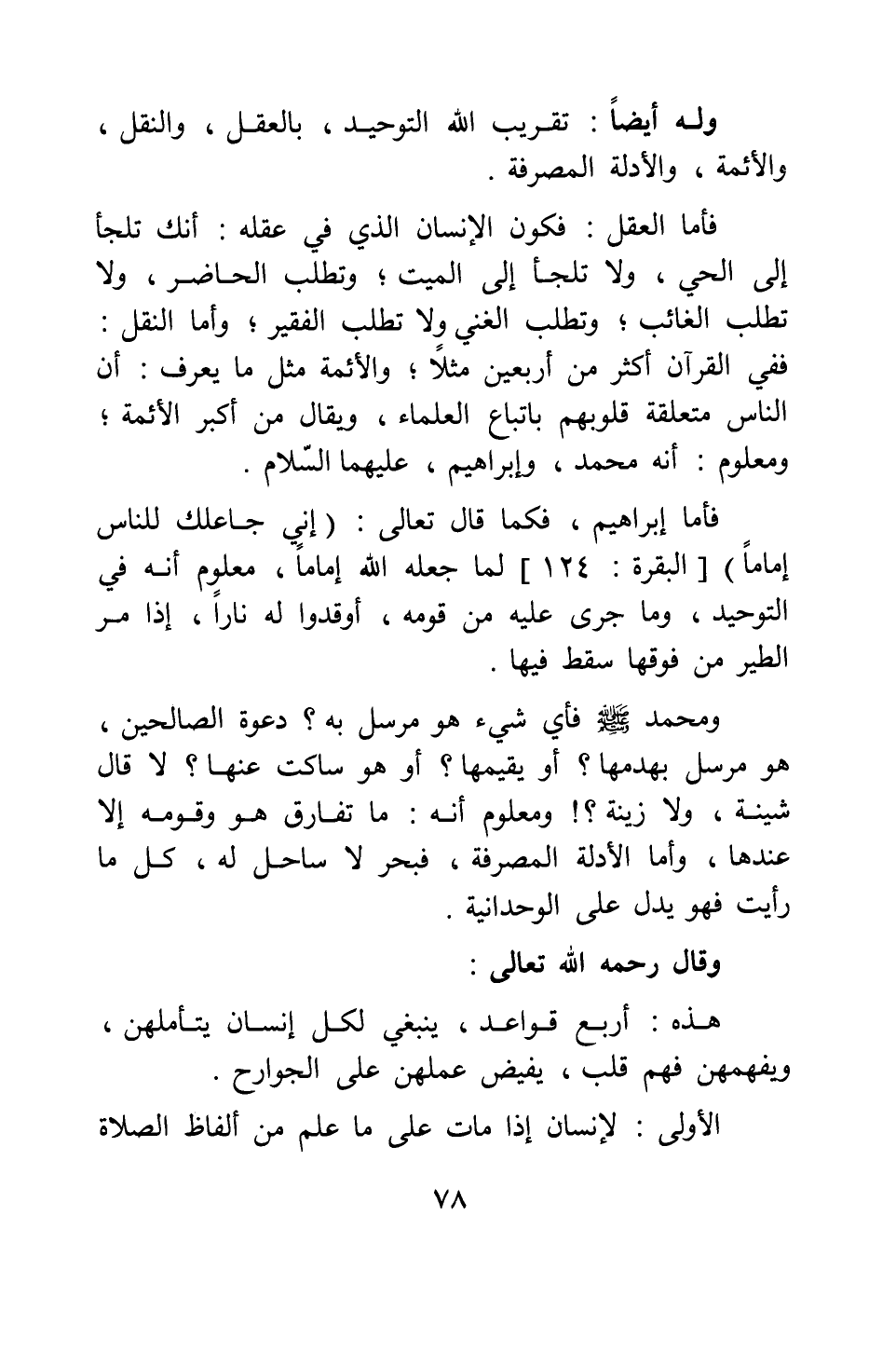 هذه: أربع قواعد، ينبغي لكل إنسان يتأملهن، ويفهمهن فهم قلب يفيض عملهن على الجوارح.