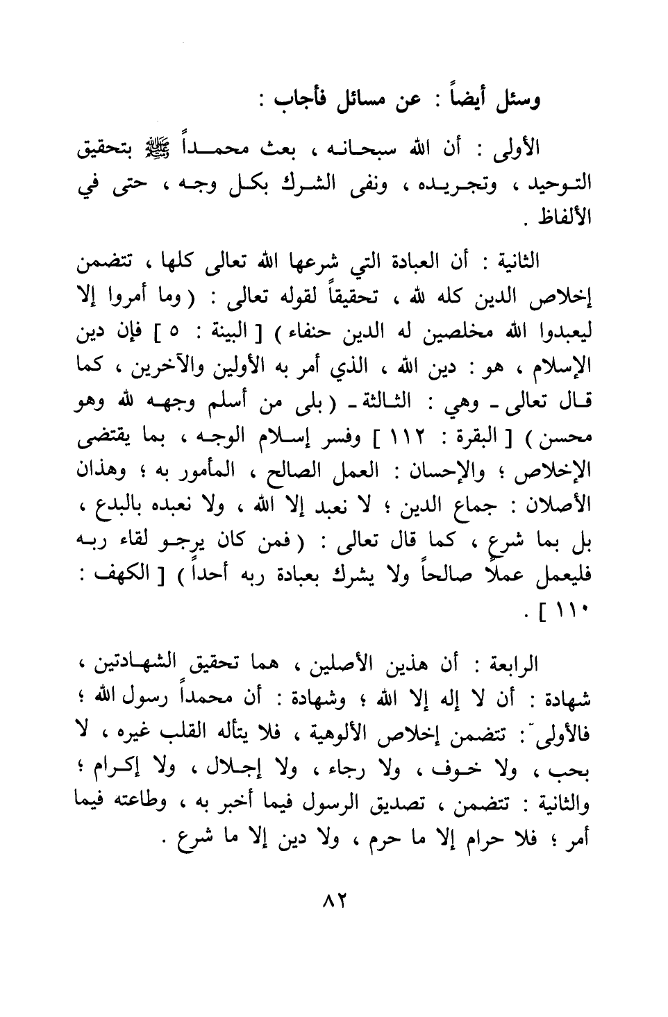 الثانية: أن العبادة التي شرعها الله تعالى كلها، تتضمن إخلاص الدين كله لله تحقيقا لقوله تعالى: {وَمَا أُمِرُوا إِلَّا لِيَعْبُدُوا اللَّهَ مُخْلِصِينَ لَهُ الدِّينَ حُنَفَاءَ} [سورة البينة آية: 5] ؛ فإن دين الإسلام، هو دين الله، الذي أمر به الأولين والآخرين، كما قال تعالى" وهي: الثالثة" {بَلَى مَنْ أَسْلَمَ وَجْهَهُ لِلَّهِ وَهُوَ مُحْسِنٌ} [سورة البقرة آية: 112] ، وفسر إسلام الوجه بما يقتضى الإخلاص; والإحسان: العمل الصالح، المأمور به; وهذان الأصلان جماع الدين; لا نعبد إلا الله، ولا نعبده بالبدع، بل بما شرع، كما قال تعالى: {فَمَنْ كَانَ يَرْجُوا لِقَاءَ رَبِّهِ فَلْيَعْمَلْ عَمَلاً صَالِحاً وَلا يُشْرِكْ بِعِبَادَةِ رَبِّهِ أَحَداً} [سورة الكهف آية: 110] .