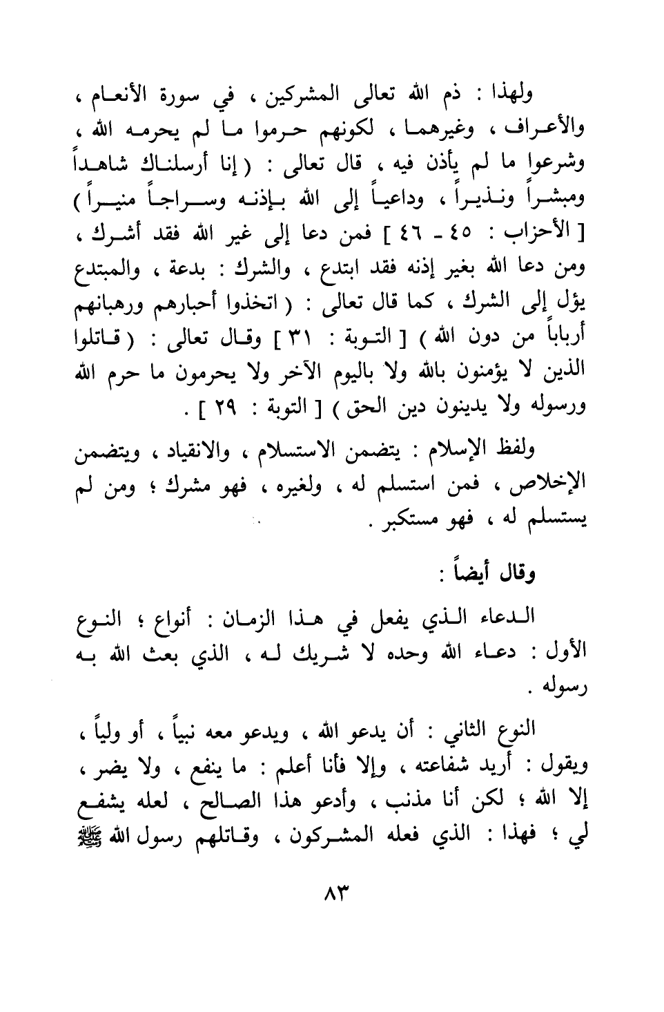 ولهذا ذم الله تعالى المشركين، في سورة الأنعام، والأعراف، وغيرهما، لكونهم حرموا ما لم يحرمه الله، وشرعوا ما لم يأذن فيه، قال تعالى: {إِنَّا أَرْسَلْنَاكَ شَاهِداً وَمُبَشِّراً وَنَذِيراً وَدَاعِياً إِلَى اللَّهِ بِإِذْنِهِ وَسِرَاجاً مُنِيراً} [سورة الأحزاب آية: 45"46] . فمن دعا إلى غير الله فقد أشرك، ومن دعا الله بغير إذنه فقد ابتدع، والشرك بدعة، والمبتدع يؤل إلى الشرك، كما قال تعالى: {اتَّخَذُوا أَحْبَارَهُمْ وَرُهْبَانَهُمْ أَرْبَاباً مِنْ دُونِ اللَّهِ} [سورة التوبة آية: 31] ، وقال تعالى: {قَاتِلُوا الَّذِينَ لا يُؤْمِنُونَ بِاللَّهِ وَلا بِالْيَوْمِ الْآخِرِ وَلا يُحَرِّمُونَ مَا حَرَّمَ اللَّهُ وَرَسُولُهُ وَلا يَدِينُونَ دِينَ الْحَقِّ} [سورة التوبة آية: 29] .
