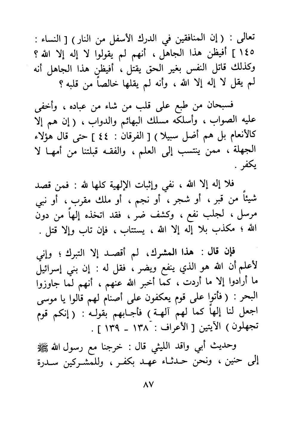 تعالى: {إِنَّ الْمُنَافِقِينَ فِي الدَّرْكِ الْأَسْفَلِ مِنَ النَّارِ} [سورة النساء آية: 145] ، أفيظن هذا الجاهل أنهم لم يقولوا لا إله إلا الله؟ وكذلك قاتل النفس بغير الحق يقتل، أفيظن هذا الجاهل أنه لم يقل لا إله إلا الله، وأنه لم يقلها خالصا من قلبه؟