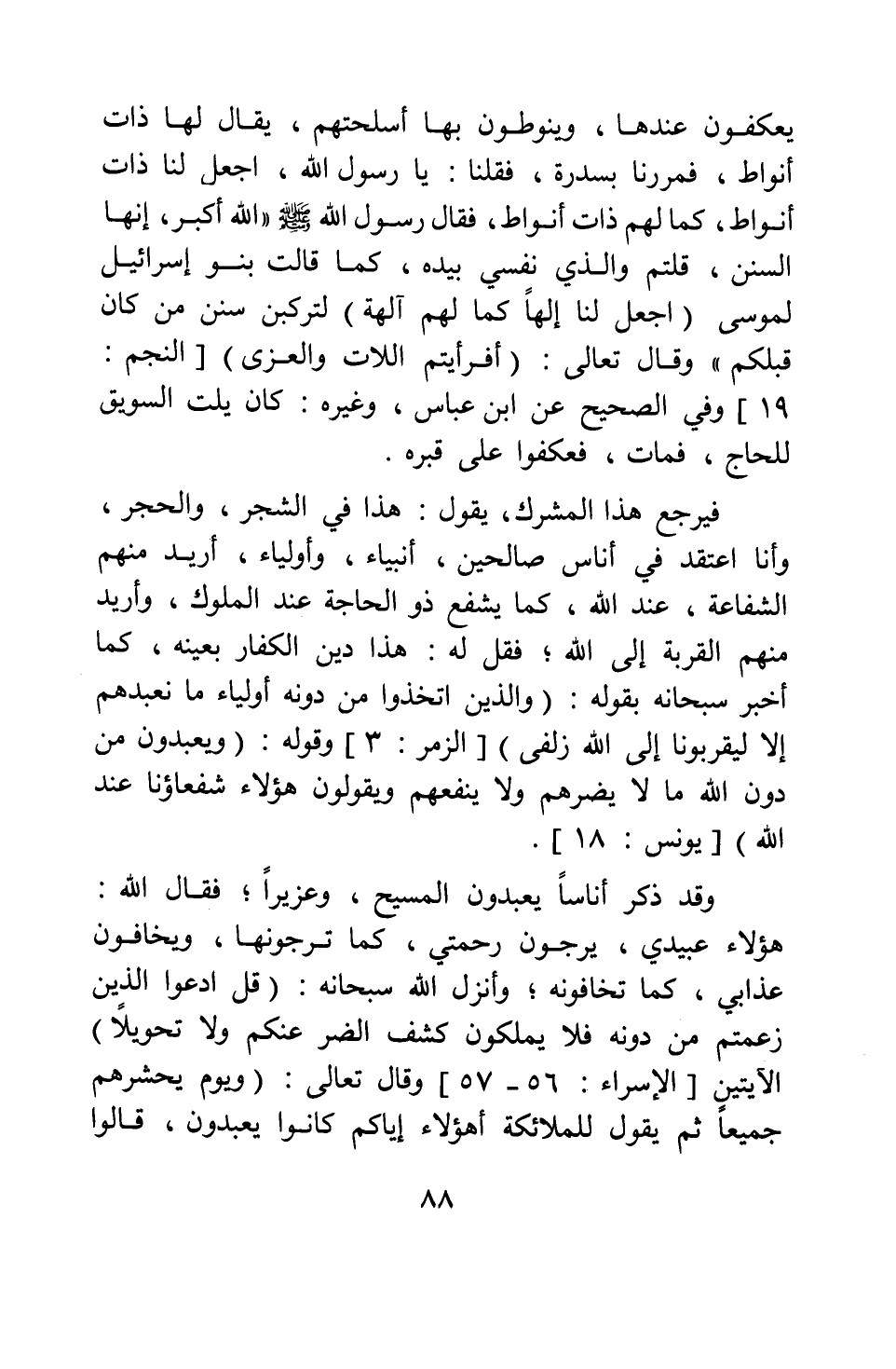 يعكفون عندها، وينوطون بها أسلحتهم، يقال لها ذات أنواط، فمررنا بسدرة، فقلنا: يا رسول الله، اجعل لنا ذات أنواط، كما لهم ذات أنواط، فقال رسول الله صلى الله عليه وسلم الله أكبر، إنها السنن، قلتم والذي نفسي بيده، كما قالت بنو إسرائيل لموسى" {اجْعَلْ لَنَا إِلَهاً كَمَا لَهُمْ آلِهَةٌ} لتركبن سنن من كان قبلكم" وقال تعالى: {أَفَرَأَيْتُمُ اللَّاتَ وَالْعُزَّى} [سورة النجم آية: 19] ، وفي الصحيح عن ابن عباس، وغيره: "كان يلت السويق للحاج، فمات، فعكفوا على قبره".