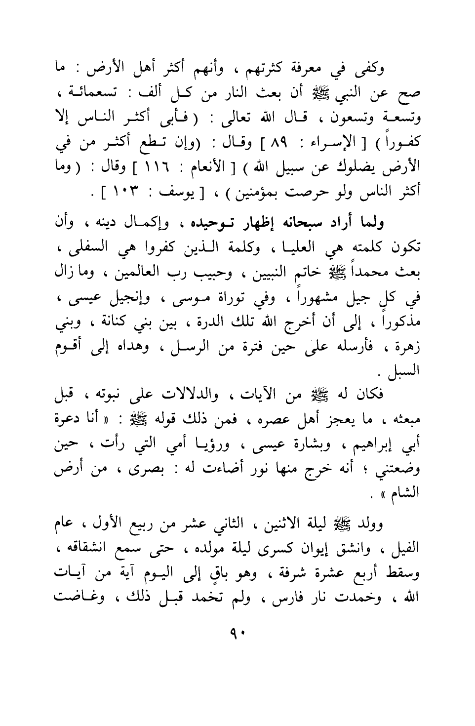 وولد صلى الله عليه وسلم ليلة الاثنين، الثاني عشر من ربيع الأول، عام الفيل، وانشق إيوان كسرى ليلة مولده، حتى سمع انشقاقه، وسقط أربع عشرة شرفة، وهو باق إلى اليوم آية من آيات الله، وخمدت نار فارس، ولم تخمد قبل ذلك، وغاضت