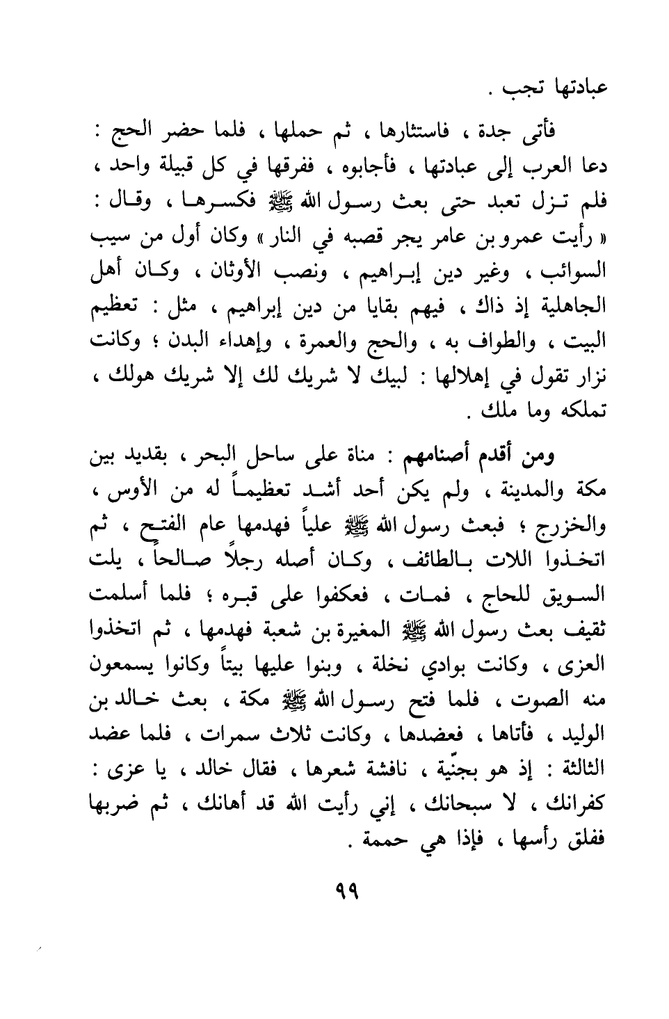 فأتى جدة فاستثارها، ثم حملها. فلما حضر الحج، دعا العرب إلى عبادتها، فأجابوه، ففرقها في كل قبيلة واحد، فلم تزل تعبد حتى بعث رسول الله صلى الله عليه وسلم فكسرها، وقال: " رأيت عمرو بن عامر يجر قصبه في النار "1، وكان أول من سيب السوائب، وغير دين إبراهيم، ونصب الأوثان، وكان أهل الجاهلية إذ ذاك، فيهم بقايا من دين إبراهيم، مثل تعظيم البيت، والطواف به، والحج والعمرة، وإهداء البدن; وكانت نزار تقول في إهلالها: لبيك لا شريك لك، إلا شريك هو لك، تملكه وما ملك.