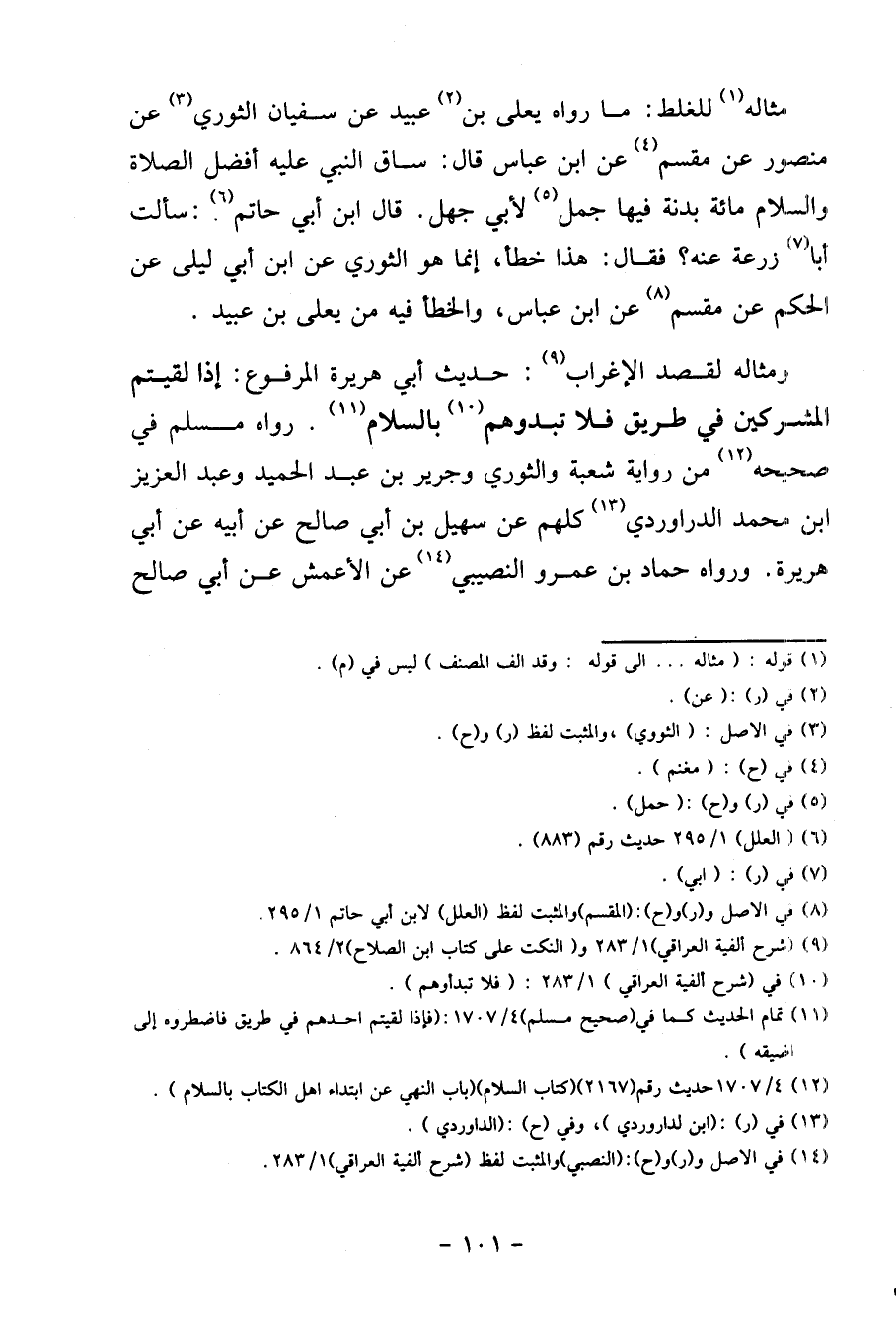 مِثَاله للغلط: مَا رَوَاهُ يعلى بن عبيد عَن سُفْيَان الثَّوْريّ عَن مَنْصُور عَن مقسم عَن ابْن عَبَّاس قَالَ: سَاق النَّبِي عَلَيْهِ أفضل الصَّلَاة وَالسَّلَام مائَة بَدَنَة فِيهَا جمل لأبي جهل. قَالَ ابْن أبي حَاتِم: سَأَلت أَبَا زرْعَة عَنهُ؟ فَقَالَ: هَذَا خطأ، إِنَّمَا هُوَ الثَّوْريّ عَن ابْن أبي ليلى عَن الحكم عَن مقسم عَن ابْن عَبَّاس، وَالْخَطَأ فِيهِ من يعلى بن عبيد.