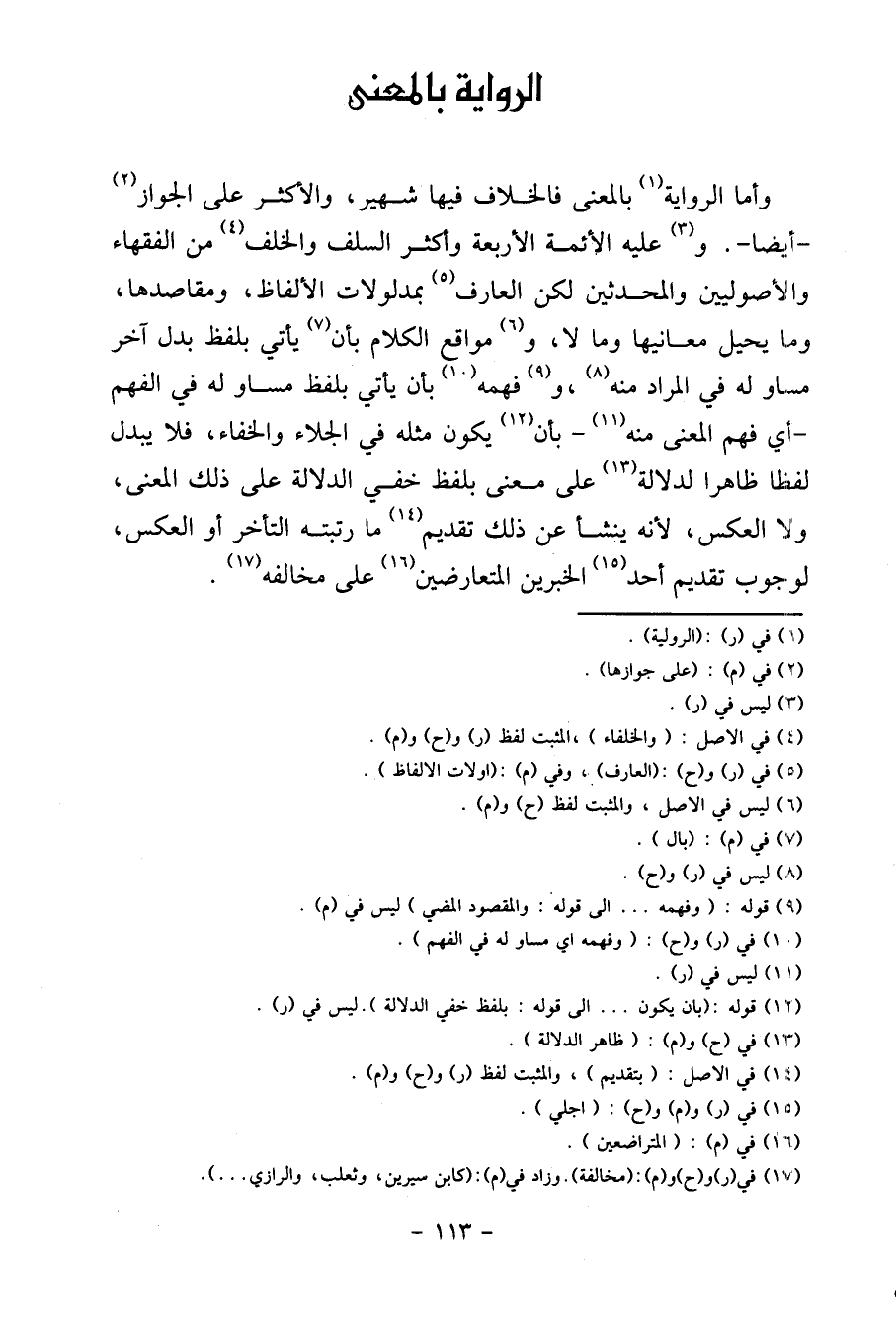 وَأما الرِّوَايَة بِالْمَعْنَى فَالْخِلَاف فِيهَا شهير، وَالْأَكْثَر على الْجَوَاز - أَيْضا -. وَعَلِيهِ الْأَئِمَّة الْأَرْبَعَة وَأكْثر السّلف وَالْخلف من الْفُقَهَاء والأصوليين والمحدثين لَكِن الْعَارِف بمدلولات الْأَلْفَاظ، ومقاصدها، وَمَا يحِيل مَعَانِيهَا وَمَا لَا، مواقع الْكَلَام بِأَن يَأْتِي بِلَفْظ بدل آخر مسَاوٍ لَهُ فِي المُرَاد مِنْهُ وفهمه بِأَن يَأْتِي بِلَفْظ مسَاوٍ لَهُ فِي الْفَهم أَي فهم الْمَعْنى مِنْهُ - بِأَن يكون مثله فِي الْجلاء والخفاء، فَلَا يُبدل لفظا ظَاهرا لدلَالَة على معنى بِلَفْظ خَفِي الدّلَالَة على ذَلِك الْمَعْنى، وَلَا الْعَكْس، لِأَنَّهُ ينشأ عَن ذَلِك تَقْدِيم مَا رتبته التَّأَخُّر أَو الْعَكْس، لوُجُوب تَقْدِيم أحد الْخَبَرَيْنِ المتعارضين على مُخَالفَة.