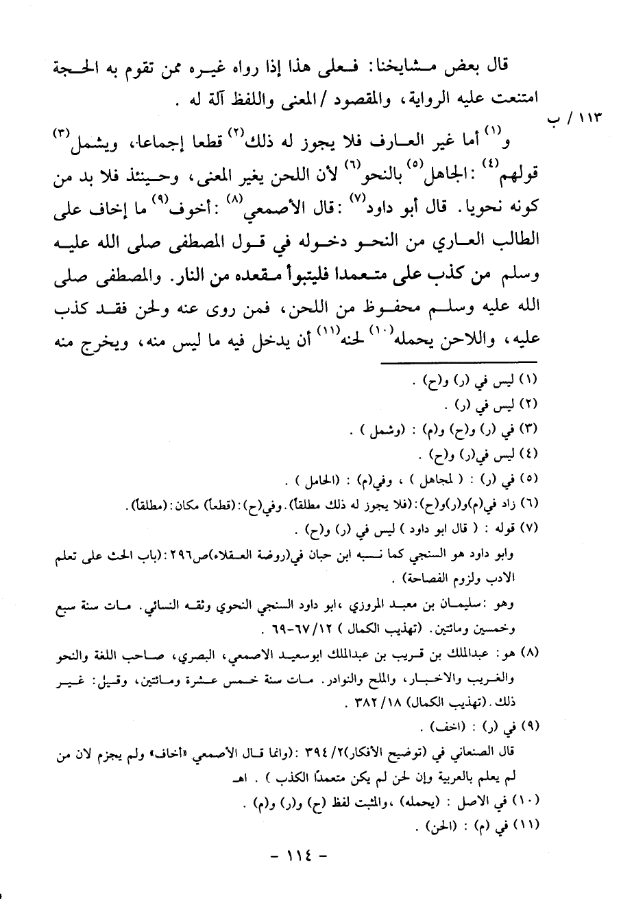وَأما غير الْعَارِف فَلَا يجوز لَهُ ذَلِك قطعا إِجْمَاعًا، ويشمل قَوْلهم: الْجَاهِل بالنحو لِأَن اللّحن يُغير الْمَعْنى، وَحِينَئِذٍ فَلَا بُد من كَونه نحويا. قَالَ أَبُو دَاوُد: قَالَ الْأَصْمَعِي: أخوف مَا إخاف على الطَّالِب العاري من النَّحْو دُخُوله فِي قَول الْمُصْطَفى من كذب عَليّ مُتَعَمدا فَليَتَبَوَّأ مَقْعَده من النَّار. والمصطفى مَحْفُوظ من اللّحن، فَمن روى عَنهُ ولحن فقد كذب عَلَيْهِ، واللاحن يحملهُ لحنه أَن يدْخل فِيهِ مَا لَيْسَ مِنْهُ، وَيخرج مِنْهُ
