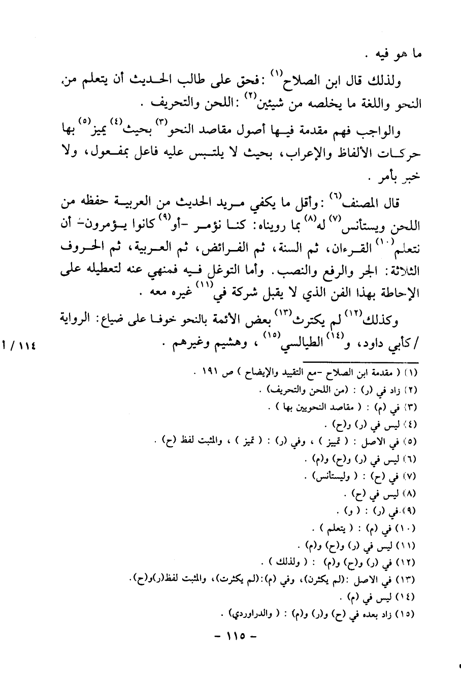 وَلذَلِك قَالَ ابْن الصّلاح: فَحق على طَالب الحَدِيث أَن يتَعَلَّم من النَّحْو واللغة مَا يخلصه من شَيْئَيْنِ: اللّحن والتحريف.