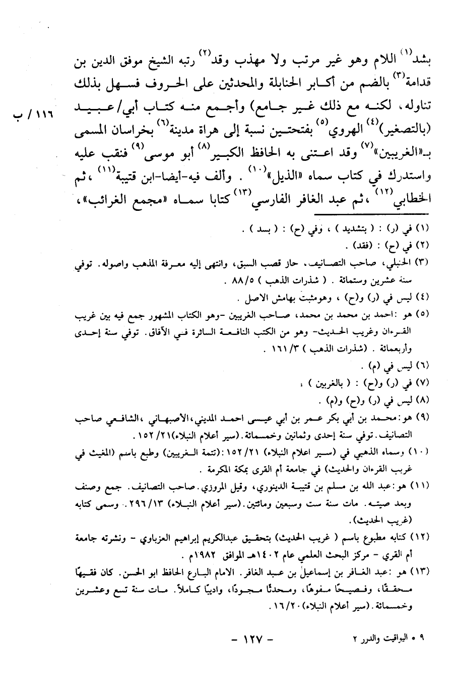 بشد اللَّام وَهُوَ غير مُرَتّب وَلَا مهذب وَقد رتبه الشَّيْخ موفق الدّين بن قدامَة بِالضَّمِّ من أكَابِر الْحَنَابِلَة والمحدثين على الْحُرُوف فسهل بذلك تنَاوله، لكنه مَعَ ذَلِك غير جَامع) وَأجْمع مِنْهُ كتاب ابي / عبيد (التصغير) الْهَرَوِيّ بِفتْحَتَيْنِ نِسْبَة إِلَى هراة مَدِينَة بخراسان الْمُسَمّى ب " الغريبين " وَقد اعتنى بِهِ الْحَافِظ الْكَبِير أَبُو مُوسَى فَنقبَ عَلَيْهِ واستدرك فِي كتاب سَمَّاهُ " الذيل ". وَألف فِيهِ - أَيْضا - ابْن قُتَيْبَة، ثمَّ الْخطابِيّ، ثمَّ عبد الغافر الْفَارِسِي كتابا سَمَّاهُ " مجمع الغرائب "،