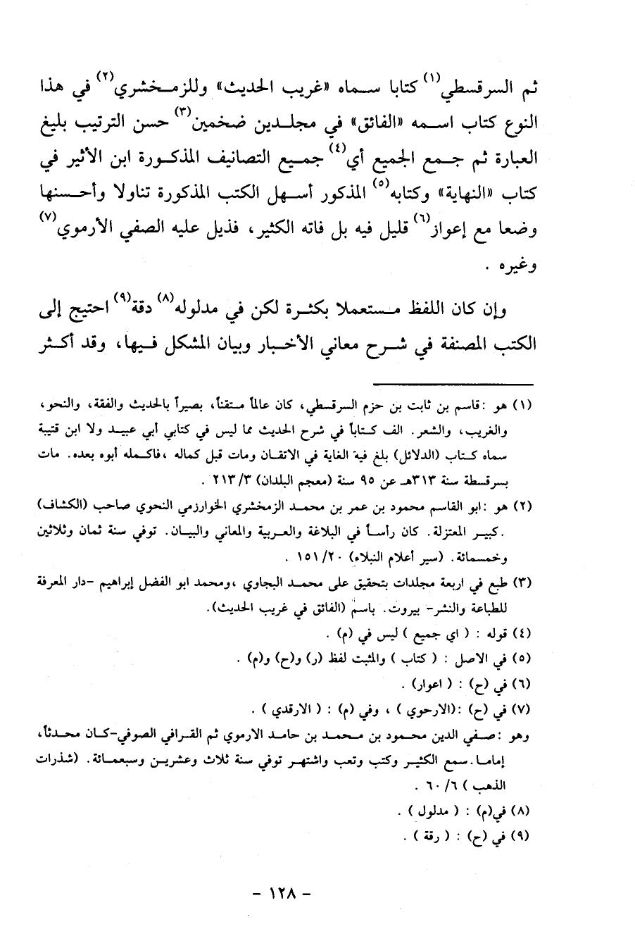 ثمَّ السَّرقسْطِي كتابا سَمَّاهُ " غَرِيب الحَدِيث " وللزمخشري فِي هَذَا النَّوْع كتاب اسْمه " الْفَائِق " فِي مجلدين ضخمين حسن التَّرْتِيب بليغ الْعبارَة ثمَّ جمع الْجَمِيع أَي جَمِيع التصانيف المذكوره ابْن الْأَثِير فِي كتاب " النِّهَايَة " وَكتابه الْمَذْكُور أسهل الْكتب المذكوره تناولا وأحسنها وضعا مَعَ إعواز قَلِيل فِيهِ بل فَاتَهُ الْكثير، فذيل عَلَيْهِ الصفي الأرموي وَغَيره.