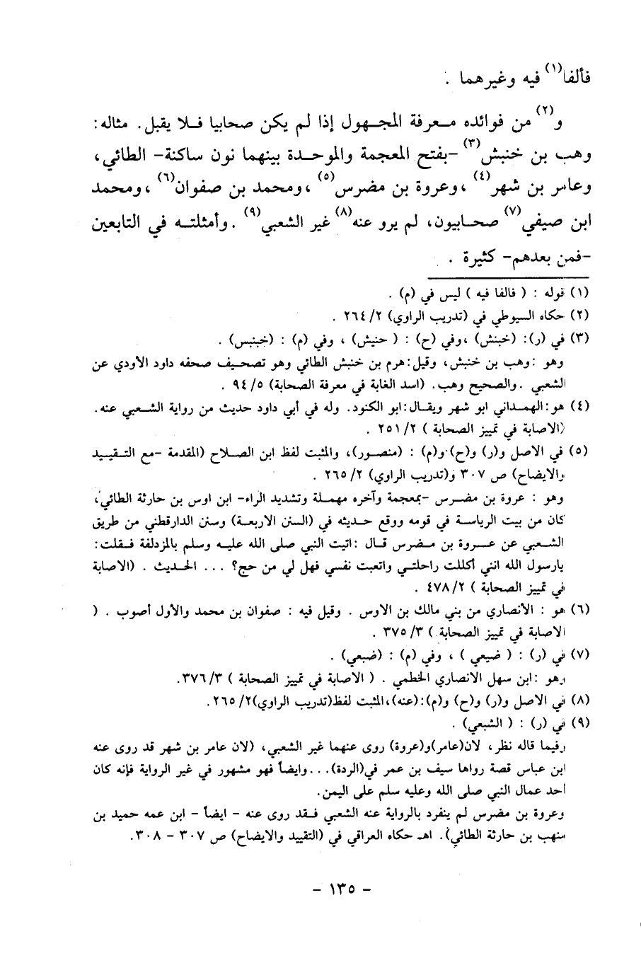 وَمن فَوَائده معرفَة الْمَجْهُول إِذا لم يكن صحابيا فَلَا يقبل. مِثَاله: وهب بن خنبش - بِفَتْح الْمُعْجَمَة وَالْمُوَحَّدَة بَينهمَا نون سَاكِنة - الطَّائِي، وعامر بن شهر، وَعُرْوَة بن مُضرس، وَمُحَمّد بن صَفْوَان، وَمُحَمّد ابْن صَيْفِي صحابيون، لم يرو عَنهُ غير الشّعبِيّ. وأمثلته فِي التَّابِعين - فَمن بعدهمْ - كَثِيرَة.
