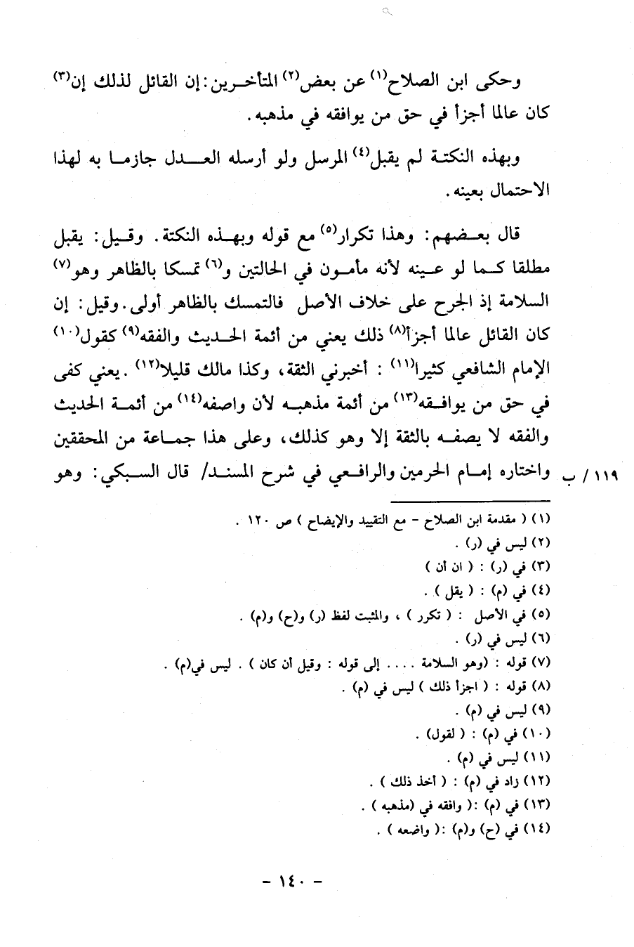 قَالَ بَعضهم: وَهَذَا تكْرَار مَعَ قَوْله وبهذه النُّكْتَة. وَقيل: يقبل مُطلقًا كَمَا لَو عينه لِأَنَّهُ مَأْمُون فِي الْحَالَتَيْنِ وتمسكا بِالظَّاهِرِ وَهُوَ السَّلامَة إِذْ الْجرْح على خلاف الأَصْل فالتمسك بِالظَّاهِرِ أولى. وَقيل: إِن كَانَ الْقَائِل عَالما أَجْزَأَ ذَلِك يَعْنِي من أَئِمَّة الحَدِيث وَالْفِقْه كَقَوْل الإِمَام الشَّافِعِي كثيرا: أَخْبرنِي الثِّقَة، وَكَذَا مَالك قَلِيلا. يَعْنِي كفى فِي حق من يُوَافقهُ من أَئِمَّة مذْهبه لِأَن واصفه من أَئِمَّة الحَدِيث وَالْفِقْه لَا يصفه بالثقة إِلَّا وَهُوَ كَذَلِك، وعَلى هَذَا جمَاعَة من الْمُحَقِّقين وَاخْتَارَهُ إِمَام الْحَرَمَيْنِ والرافعي فِي شرح الْمسند / قَالَ السُّبْكِيّ: وَهُوَ