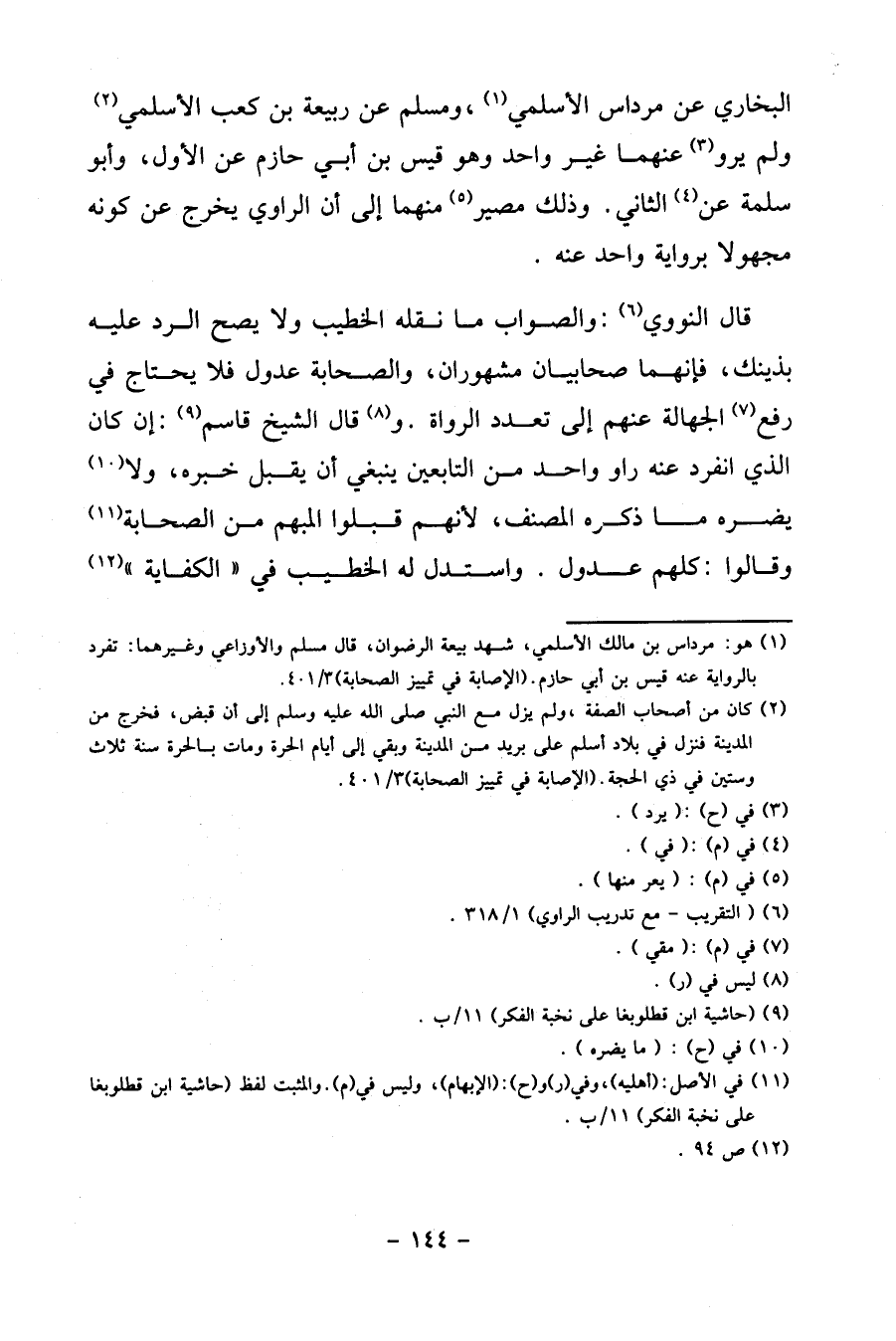قَالَ النَّوَوِيّ: وَالصَّوَاب مَا نَقله الْخَطِيب وَلَا يَصح الرَّد عَلَيْهِ بذينك، فَإِنَّهُمَا صحابيان مشهوران، وَالصَّحَابَة عدُول فَلَا يحْتَاج فِي رفع الْجَهَالَة عَنْهُم إِلَى تعدد الروَاة. وَقَالَ الشَّيْخ قَاسم: إِن كَانَ الَّذِي انْفَرد عَنهُ راو وَاحِد من التَّابِعين يَنْبَغِي أَن يقبل خَبره، وَلَا يضرّهُ مَا ذكره المُصَنّف، لأَنهم قبلوا الْمُبْهم من الصَّحَابَة وَقَالُوا: كلهم عدُول. وَاسْتدلَّ لَهُ الْخَطِيب فِي " الْكِفَايَة "