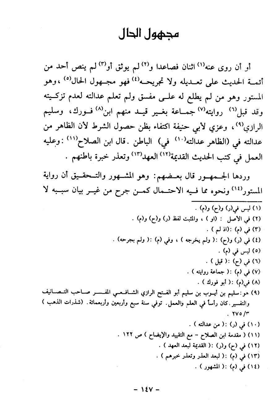 أَو أَن روى عَنهُ اثْنَان فَصَاعِدا وَلم يوثق أَو لم ينص أحد من أَئِمَّة الحَدِيث على تعديله وَلَا تجريحه فَهُوَ مَجْهُول الْحَال، وَهُوَ المستور وَهُوَ من لم يطلع لَهُ على مفسق وَلم تعلم عَدَالَته لعدم تزكيته وَقد قبل رِوَايَته جمَاعَة بِغَيْر قيد مِنْهُم ابْن فورك، وسليم الرَّازِيّ، وعزي لأبي حنيفَة اكْتِفَاء بِظَنّ حُصُول الشَّرْط لِأَن الظَّاهِر من عَدَالَته فِي (الظَّاهِر عَدَالَته فِي) الْبَاطِن. قَالَ ابْن الصّلاح: وَعَلِيهِ الْعَمَل فِي كتب الحَدِيث الْقَدِيمَة الْعَهْد وَتعذر خبْرَة باطنهم.