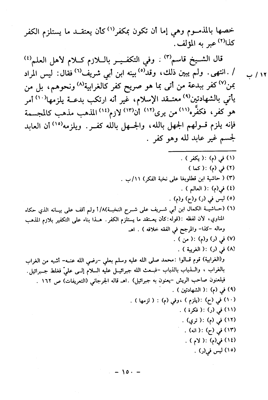 قَالَ الشَّيْخ قَاسم: وَفِي التَّكْفِير باللازم كَلَام لأهل الْعلم /. انْتهى. وَلم يبين ذَلِك، وَقد بَينه ابْن أبي شرِيف فَقَالَ: لَيْسَ المُرَاد بِمن كفر ببدعة من أَتَى بِمَا هُوَ صَرِيح كفر كالغرابية وَنَحْوهم، بل من يَأْتِي بِالشَّهَادَتَيْنِ مُعْتَقد الْإِسْلَام، غير أَنه ارْتكب بِدعَة يلْزمهَا أَمر هُوَ كفر، فكفره من يرى أَن لَازم الْمَذْهَب مَذْهَب كالمجسمة فَإِنَّهُ يلْزم قَوْلهم الْجَهْل بِاللَّه، وَالْجهل بِاللَّه كفر. وَيلْزمهُ أَن العابد لجسم غير عَابِد لله وَهُوَ كفر.