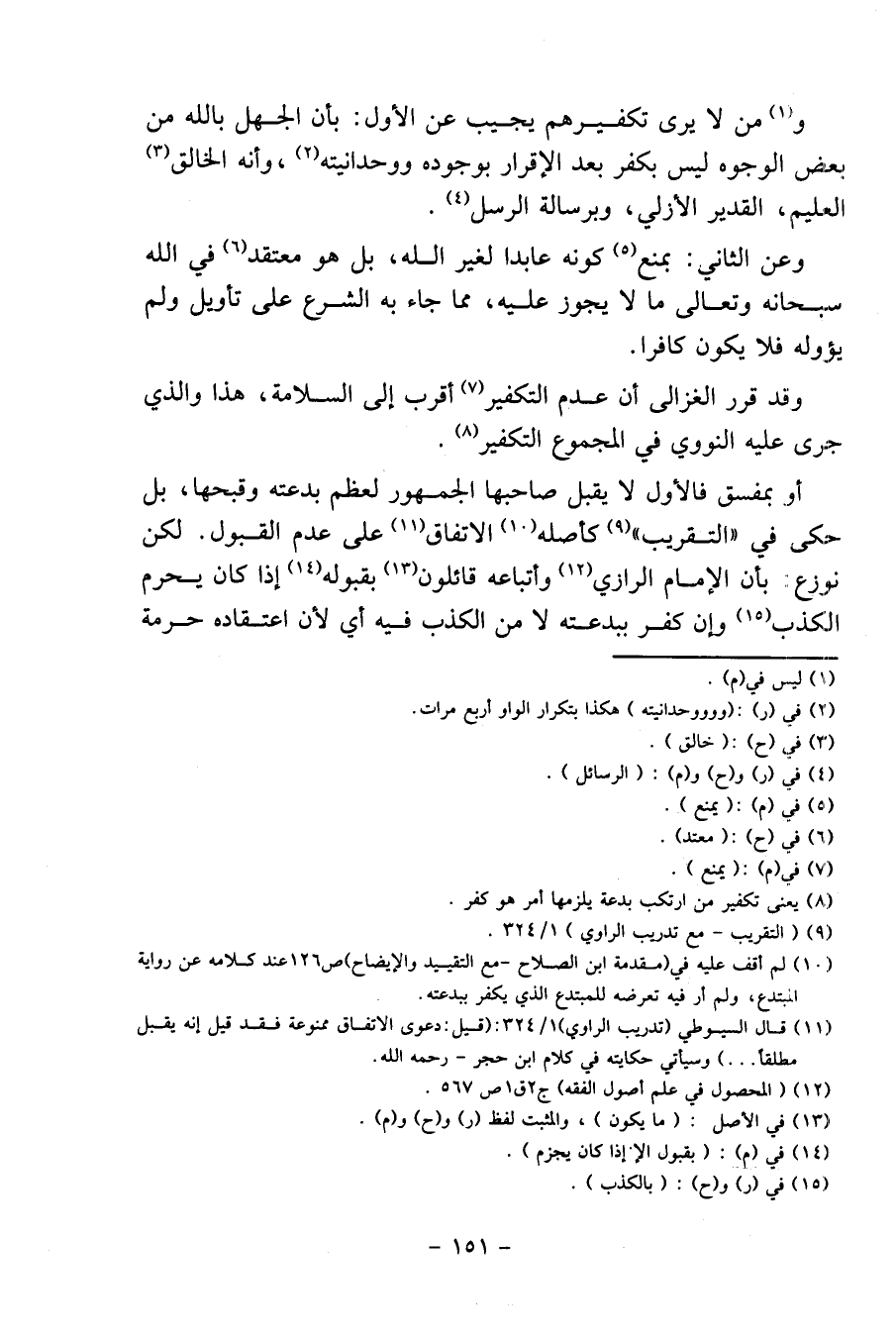 وَقد قرر الْغَزالِيّ أَن عدم التَّكْفِير اقْربْ إِلَى السَّلامَة، هَذَا وَالَّذِي جرى عَلَيْهِ النَّوَوِيّ فِي الْمَجْمُوع التَّكْفِير.