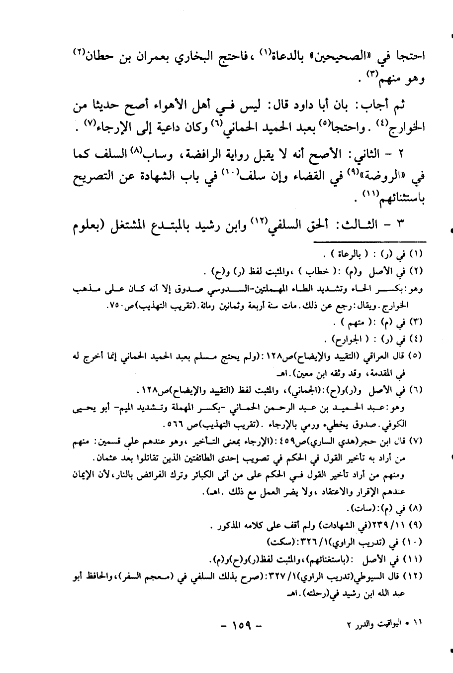 ثمَّ أجَاب: بَان أَبَا دَاوُد قَالَ: لَيْسَ فِي أهل الْأَهْوَاء أصح حَدِيثا من الْخَوَارِج. واحتجا بِعَبْد الحميد الْحمانِي وَكَانَ دَاعِيَة إِلَى الإرجاء. 2 - الثَّانِي: الْأَصَح أَنه لَا يقبل رِوَايَة الرافضة، وساب السّلف كَمَا فِي " الرَّوْضَة " فِي الْقَضَاء وَإِن سلف فِي بَاب الشَّهَادَة عَن التَّصْرِيح باستثنائهم. 3 - الثَّالِث: ألحق السلَفِي وَابْن رشيد بالمبتدع المشتغل (بعلوم