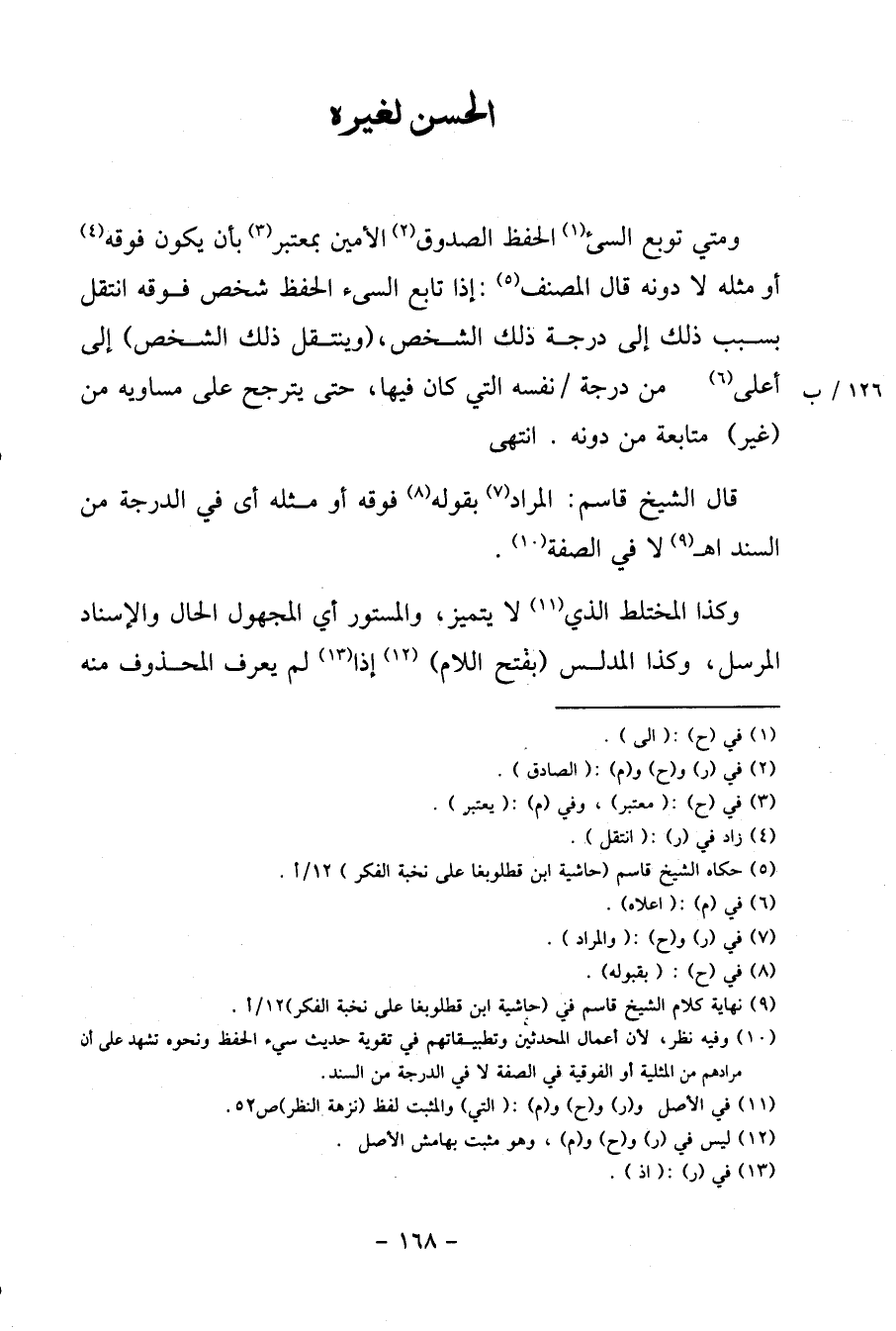 وَمَتى توبع السئ الْحِفْظ الصدوق الْأمين بمعتبر بِأَن يكون فَوْقه أَو مثله لَا دونه قَالَ المُصَنّف: إِذا تَابع السيء الْحِفْظ شخص فَوْقه انْتقل بِسَبَب ذَلِك إِلَى دَرَجَة ذَلِك الشَّخْص، (وينتقل ذَلِك الشَّخْص) إِلَى أَعلَى من دَرَجَة / نَفسه الَّتِي كَانَ فِيهَا، حَتَّى يتَرَجَّح على مساويه من (غير) مُتَابعَة من دونه. انْتهى.