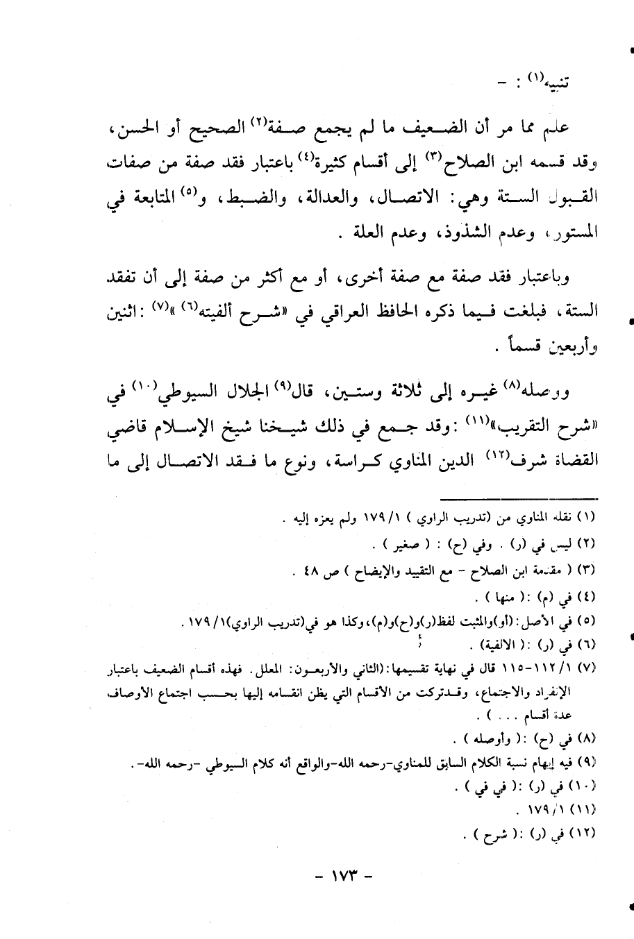 علم مِمَّا مر أَن الضَّعِيف مَا لم يجمع صفة الصَّحِيح أَو الْحسن، وَقد قسمه ابْن الصّلاح إِلَى أَقسَام كَثِيرَة بِاعْتِبَار فقد صفة من صِفَات الْقبُول السِّتَّة وَهِي: الِاتِّصَال، وَالْعَدَالَة، والضبط، والمتابعة فِي المستور، وَعدم الشذوذ، وَعدم الْعلَّة.