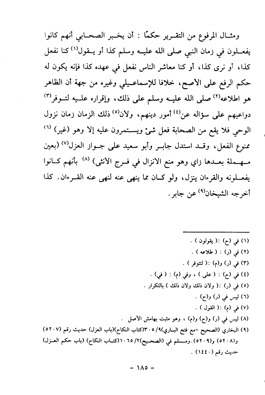 وَمِثَال الْمَرْفُوع من التَّقْرِير حكما: أَن يخبر الصَّحَابِيّ أَنهم كَانُوا يَفْعَلُونَ فِي زمَان النَّبِي كَذَا أَو يَقُول كُنَّا نَفْعل كَذَا، أَو نرى كَذَا، أَو كُنَّا معاشر النَّاس نَفْعل فِي عَهده كَذَا فَإِنَّهُ يكون لَهُ حكم الرّفْع على الاصح، خلافًا للإسماعيلي وَغَيره من جِهَة أَن الظَّاهِر هُوَ اطِّلَاعه على ذَلِك، وَإِقْرَاره عَلَيْهِ لتوفر دواعيهم على سُؤَاله عَن أُمُور دينهم، وَلِأَن ذَلِك الزَّمَان زمَان نزُول الْوَحْي فَلَا يَقع من الصَّحَابَة فعل شَيْء ويستمرون عَلَيْهِ إِلَّا وَهُوَ (غير) مَمْنُوع الْفِعْل، وَقد اسْتدلَّ جَابر وَأَبُو سعيد على جَوَاز الْعَزْل (بِعَين مُهْملَة بعْدهَا زَاي وَهُوَ منع الْإِنْزَال فِي فرج الْأُنْثَى) بِأَنَّهُم كَانُوا يَفْعَلُونَهُ والقرءان ينزل، وَلَو كَانَ مِمَّا ينْهَى عَنهُ لنهى عَنهُ القرءان. كَذَا أخرجه الشَّيْخَانِ عَن جَابر.