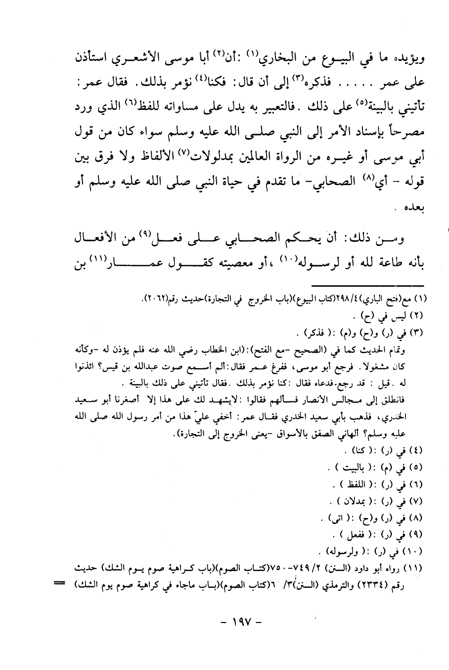 وَيُؤَيِّدهُ مَا فِي الْبيُوع من البُخَارِيّ: أَن أَبَا مُوسَى الْأَشْعَرِيّ اسْتَأْذن على عمر. . فَذكره إِلَى أَن قَالَ: فَكُنَّا نؤمر بذلك. فَقَالَ عمر: تَأتِينِي بِالْبَيِّنَةِ على ذَلِك. فالتعبير بِهِ يدل على مساواته للفظ الَّذِي ورد مُصَرحًا بِإِسْنَاد الْأَمر إِلَى النَّبِي سَوَاء كَانَ من قَول أبي مُوسَى أَو غَيره من الروَاة الْعَالمين بمدلولات الْأَلْفَاظ وَلَا فرق بَين قَوْله - أَي الصَّحَابِيّ - مَا تقدم فِي حَيَاة النَّبِي أَو بعده.