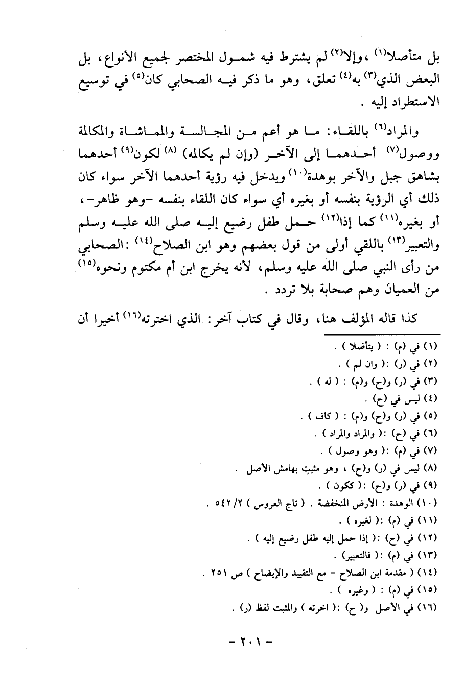 وَالْمرَاد باللقاء: مَا هُوَ أَعم من المجالسة والمماشاة والمكالمة ووصول أَحدهمَا إِلَى الآخر (وَإِن لم يكالمه) لكَون أَحدهمَا بشاهق جبل وَالْآخر بوهدة وَيدخل فِيهِ رُؤْيَة أَحدهمَا الآخر سَوَاء كَانَ ذَلِك أَي الرُّؤْيَة بِنَفسِهِ أَو بِغَيْرِهِ أَي سَوَاء كَانَ اللِّقَاء بِنَفسِهِ - وَهُوَ ظَاهر -، أَو بِغَيْرِهِ كَمَا إِذا حمل طِفْل رَضِيع إِلَيْهِ وَالتَّعْبِير باللقي أولى من قَول بَعضهم وَهُوَ ابْن الصّلاح: الصَّحَابِيّ من رأى النَّبِي، لِأَنَّهُ يخرج ابْن أم مَكْتُوم وَنَحْوه من العميان وهم صحابة بِلَا تردد.