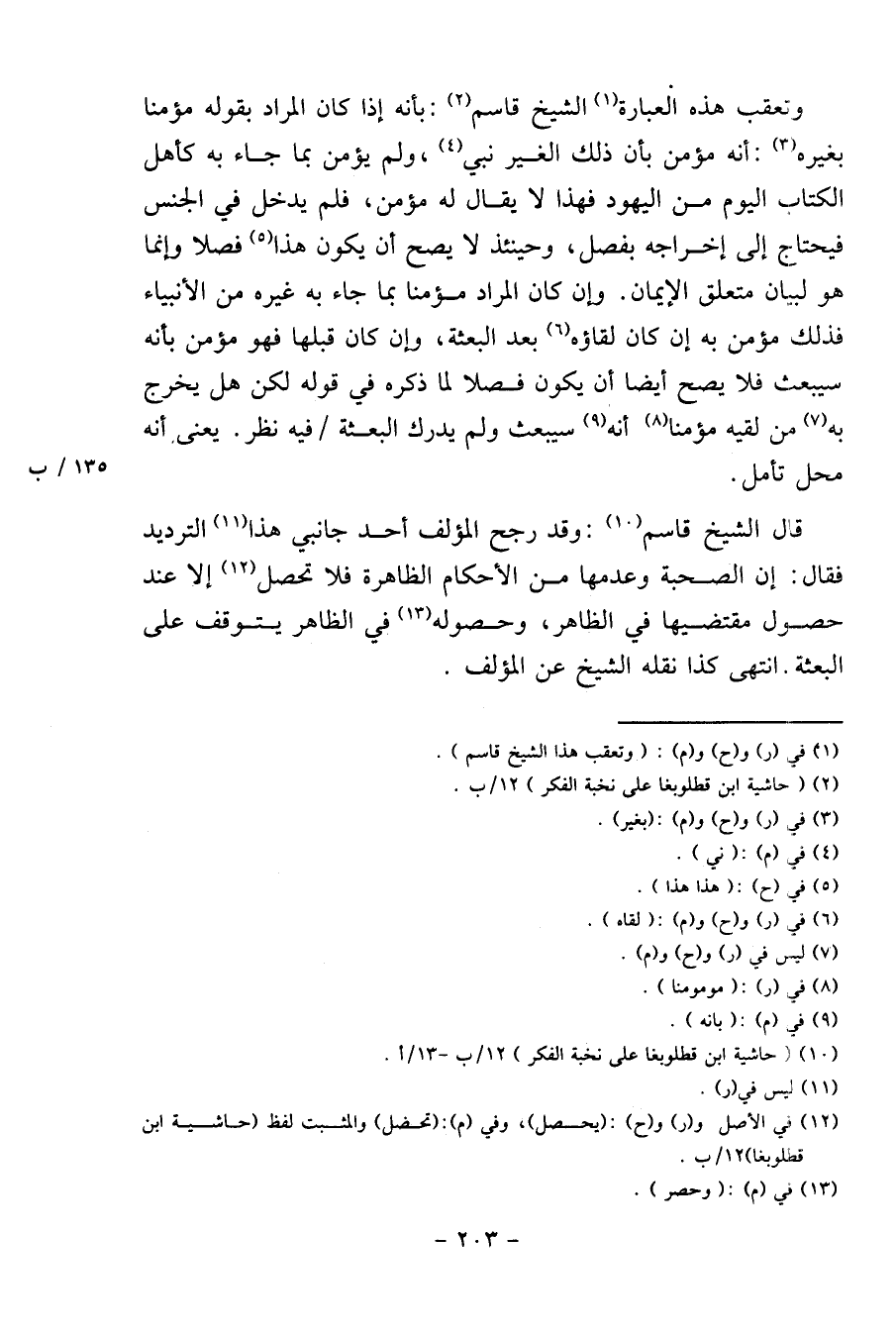 وَتعقب هَذِه الْعبارَة الشَّيْخ قَاسم: بِأَنَّهُ إِذا كَانَ المُرَاد بقوله مُؤمنا بِغَيْرِهِ: أَنه مُؤمن بِأَن ذَلِك الْغَيْر نَبِي، وَلم يُؤمن بِمَا جَاءَ بِهِ كَأَهل الْكتاب الْيَوْم من الْيَهُود فَهَذَا لَا يُقَال لَهُ مُؤمن، فَلم يدْخل فِي الْجِنْس فَيحْتَاج إِلَى إِخْرَاجه بفصل، وَحِينَئِذٍ لَا يَصح أَن يكون هَذَا فصلا وَإِنَّمَا هُوَ لبَيَان مُتَعَلق الْإِيمَان. وَإِن كَانَ المُرَاد مُؤمنا بِمَا جَاءَ بِهِ غَيره من الْأَنْبِيَاء فَذَلِك مُؤمن بِهِ إِن كَانَ لقاؤه بعد الْبعْثَة، وَإِن كَانَ قبلهَا فَهُوَ مُؤمن بِأَنَّهُ سيبعث فَلَا يَصح أَيْضا أَن يكون فصلا لما ذكره فِي قَوْله لَكِن هَل يخرج بِهِ من لقِيه مُؤمنا أَنه سيبعث وَلم يدْرك الْبعْثَة / فِيهِ نظر. يعْنى أَنه مَحل تَأمل.