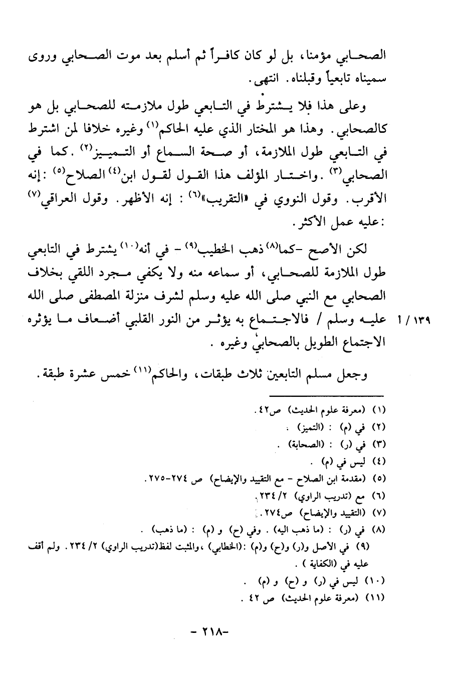 لَكِن الْأَصَح - كَمَا ذهب الْخَطِيب - فِي أَنه يشْتَرط فِي التَّابِعِيّ طول الْمُلَازمَة للصحابي، أَو سَمَاعه مِنْهُ وَلَا يَكْفِي مُجَرّد اللقي بِخِلَاف الصَّحَابِيّ مَعَ النَّبِي لشرف منزلَة الْمُصْطَفى / فالاجتماع بِهِ يُؤثر من النُّور القلبي أَضْعَاف مَا يؤثره الِاجْتِمَاع الطَّوِيل بالصحابي وَغَيره.