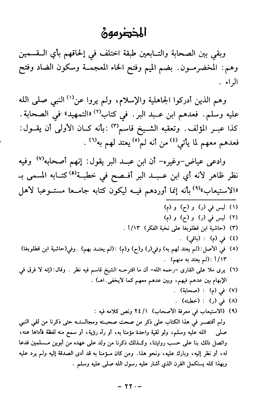 وهم الَّذين أدركوا الْجَاهِلِيَّة وَالْإِسْلَام، وَلم يرَوا عَن النَّبِي. فعدهم ابْن عبد الْبر. فِي كتاب " التَّمْهِيد " فِي الصَّحَابَة. كَذَا عبر الْمُؤلف. وَتعقبه الشَّيْخ قَاسم " بِأَنَّهُ كَانَ الأولى أَن يَقُول: فعدهم مَعَهم لما يَأْتِي من أَنه لم يعْتد لَهُم بِهِ.