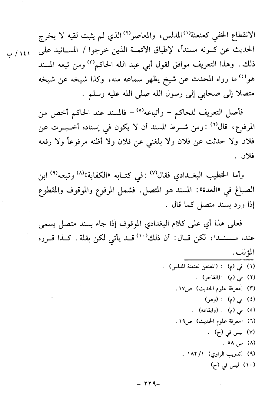 الِانْقِطَاع الْخَفي كعنعنة المدلس، والمعاصر الَّذِي لم يثبت لقِيه لَا يخرج الحَدِيث عَن كَونه مُسْندًا، لإطباق الْأَئِمَّة الَّذين خَرجُوا / المسانيد على ذَلِك. وَهَذَا التَّعْرِيف مُوَافق لقَوْل أبي عبد الله الْحَاكِم وَمن تبعه الْمسند هُوَ مَا رَوَاهُ الْمُحدث عَن شيخ يظْهر سَمَاعه مِنْهُ، وَكَذَا شَيْخه عَن شَيْخه مُتَّصِلا إِلَى صَحَابِيّ إِلَى رَسُول الله.