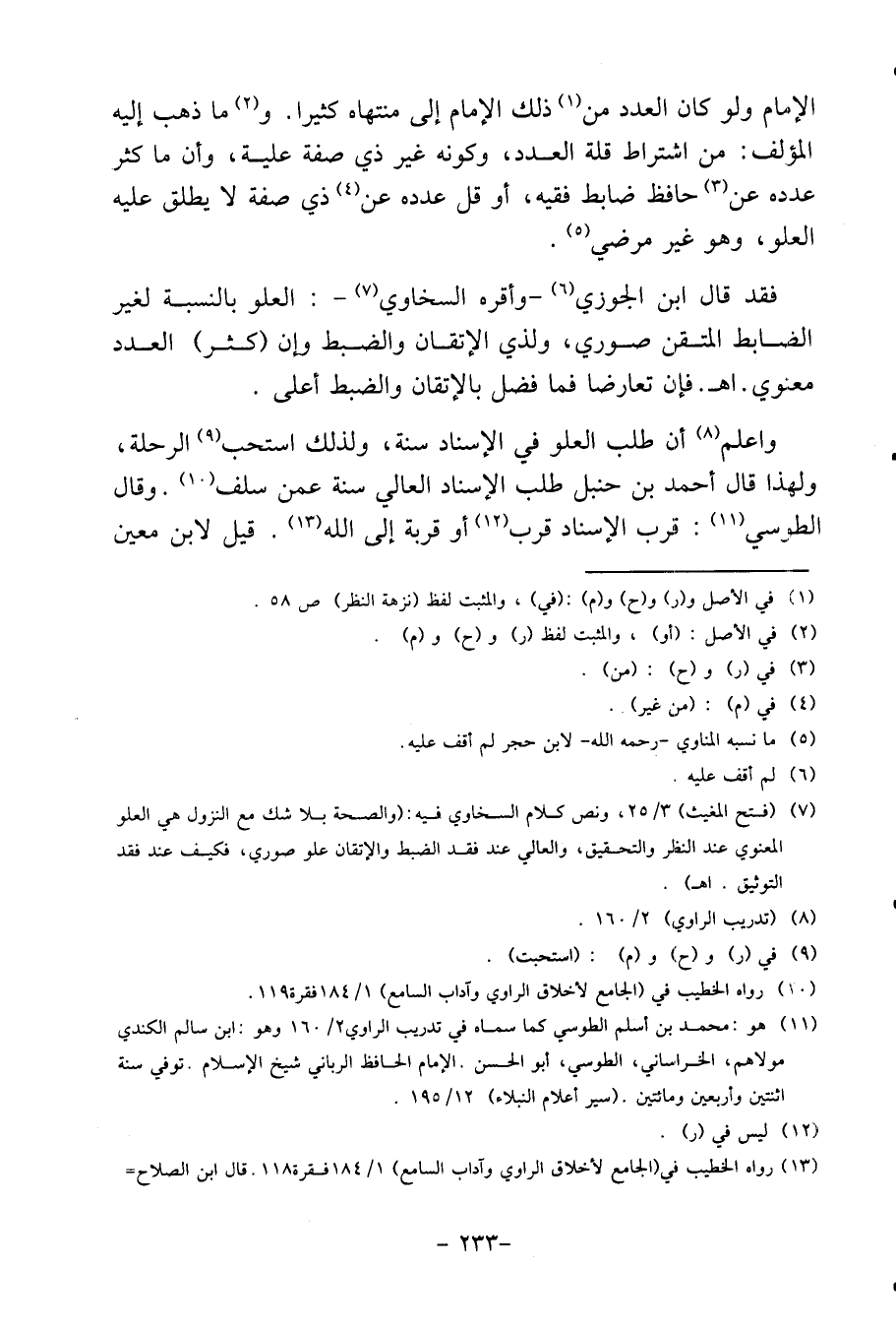 الإِمَام وَلَو كَانَ الْعدَد من ذَلِك الإِمَام إِلَى منتهاه كثيرا. وَمَا ذهب إِلَيْهِ الْمُؤلف: من اشْتِرَاط قلَّة الْعدَد، وَكَونه غير ذِي صفة عَلَيْهِ، وَأَن مَا كثر عدده عَن حَافظ ضَابِط فَقِيه، أَو قل عدده عَن ذِي صفة لَا يُطلق عَلَيْهِ الْعُلُوّ، وَهُوَ غير مرضِي.