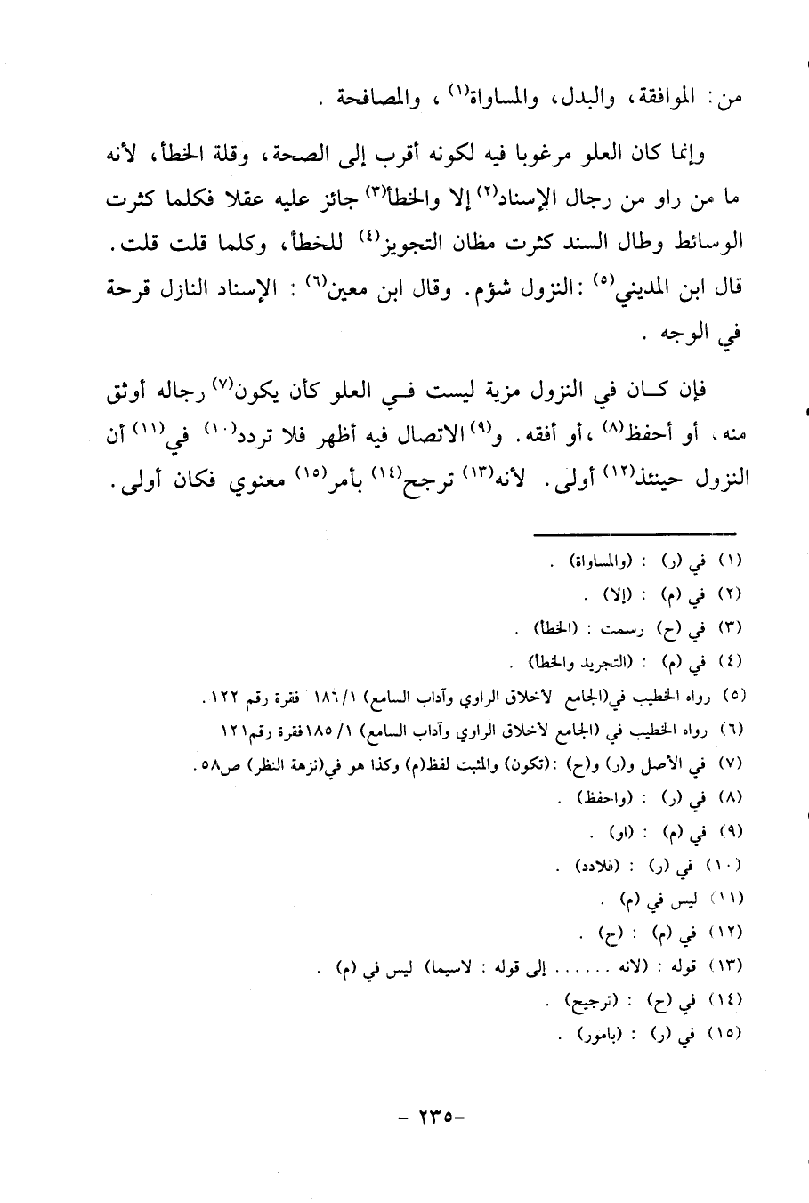 وَإِنَّمَا كَانَ الْعُلُوّ مرغوبا فِيهِ لكَونه أقرب إِلَى الصِّحَّة، وَقلة الْخَطَأ، لِأَنَّهُ مَا من راو من رجال الْإِسْنَاد إِلَّا وَالْخَطَأ جَائِز عَلَيْهِ عقلا فَكلما كثرت الوسائط وَطَالَ السَّنَد كثرت مظان التجويز للخطأ، وَكلما قلت قلت.