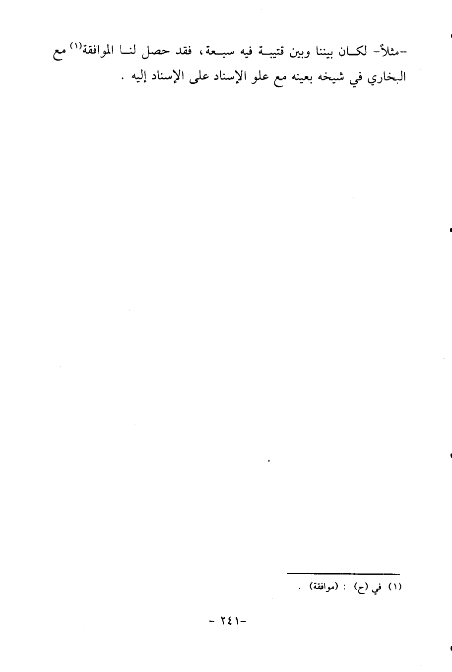 - مثلا - لَكَانَ بَيْننَا وَبَين قُتَيْبَة فِيهِ سَبْعَة، فقد حصل لنا الْمُوَافقَة مَعَ البُخَارِيّ فِي شَيْخه بِعَيْنِه مَعَ علو الْإِسْنَاد على الْإِسْنَاد إِلَيْهِ.