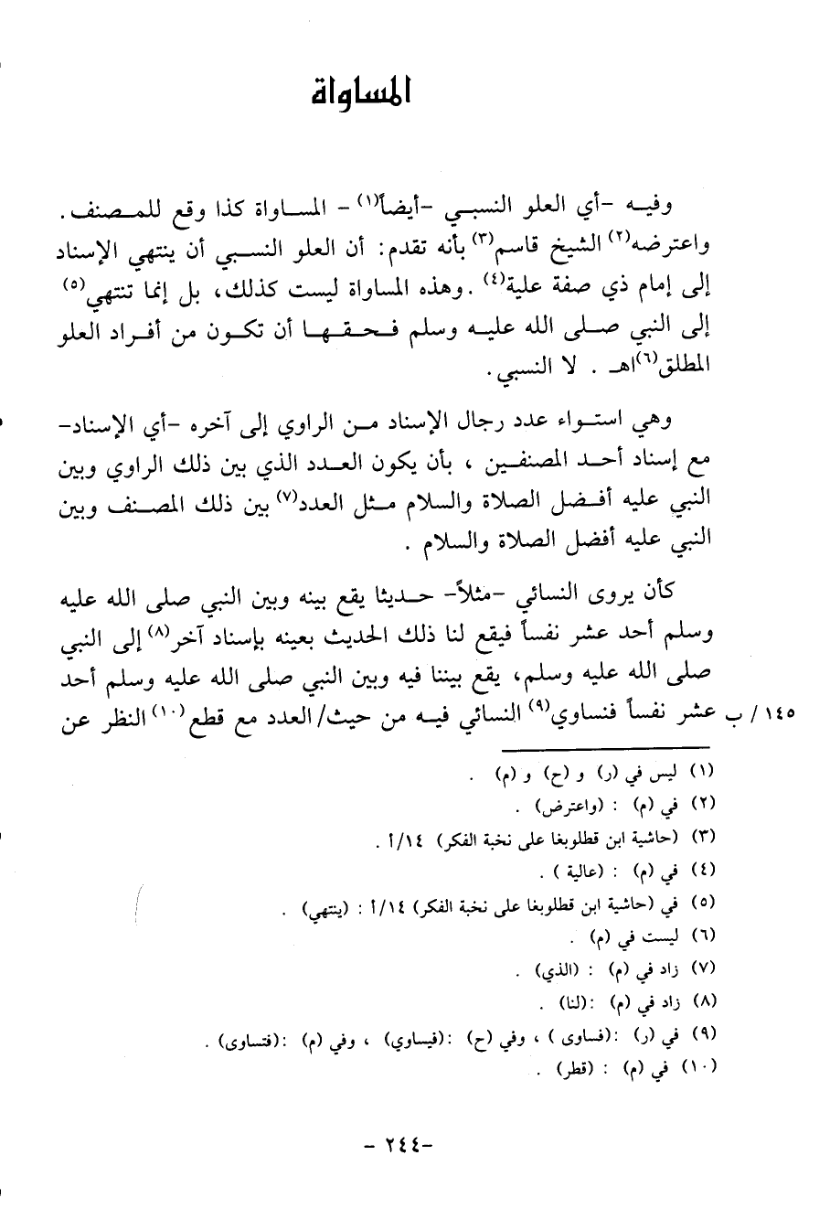 وَفِيه - أَي الْعُلُوّ النسبي - أَيْضا - الْمُسَاوَاة كَذَا وَقع للْمُصَنف. وَاعْتَرضهُ الشَّيْخ قَاسم بِأَنَّهُ تقدم: أَن الْعُلُوّ النسبي أَن يَنْتَهِي الْإِسْنَاد إِلَى إِمَام ذِي صفة عَلَيْهِ. وَهَذِه الْمُسَاوَاة لَيست كَذَلِك، بل إِنَّمَا تَنْتَهِي إِلَى النَّبِي فحقها أَن تكون من أَفْرَاد الْعُلُوّ الْمُطلق اه. لَا النسبي.