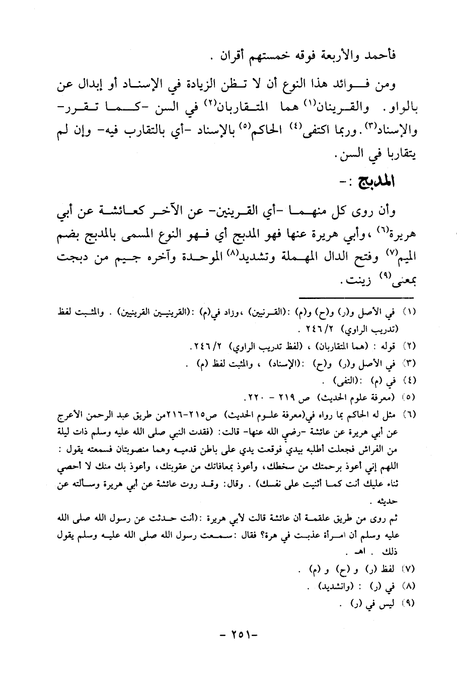 وَأَن روى كل مِنْهُمَا - أَي القرينين - عَن الآخر كعائشة عَن أبي هُرَيْرَة وَأبي هُرَيْرَة عَنْهَا فَهُوَ المدبج أَي فَهُوَ النَّوْع الْمُسَمّى بالمدبج بِضَم الْمِيم وَفتح الدَّال الْمُهْملَة وَتَشْديد الْمُوَحدَة وَآخره جِيم من دبجت بِمَعْنى زينت.