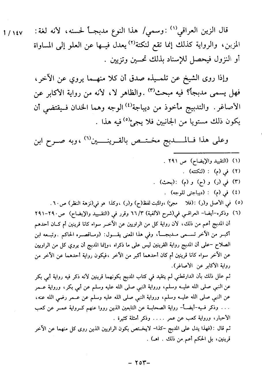 قَالَ الزين الْعِرَاقِيّ: وَسمي / هَذَا النَّوْع مدبجا لحسنه، لِأَنَّهُ لُغَة: المزين وَالرِّوَايَة كَذَلِك إِنَّمَا تقع لنكتة يعدل فِيهَا عَن الْعُلُوّ إِلَى الْمُسَاوَاة أَو النُّزُول فَيحصل للإسناد بذلك تَحْسِين وتزيين.