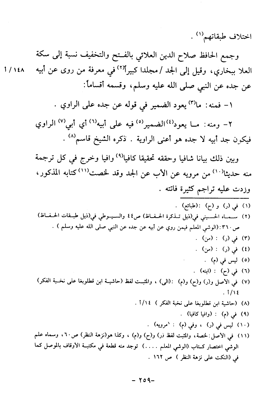 وَجمع الْحَافِظ صَلَاح الدّين العلائي بِالْفَتْح وَالتَّخْفِيف نِسْبَة إِلَى سكَّة الْعلَا ببخاري، وَقيل إِلَى الْجد / مجلدا كَبِيرا فِي معرفَة من روى عَن أَبِيه عَن جده عَن النَّبِي، وقسمه أقساما: