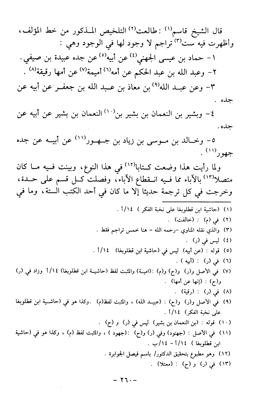قَالَ الشَّيْخ قَاسم: طالعت التَّلْخِيص الْمَذْكُور من خطّ الْمُؤلف، وأظهرت فِيهِ سِتّ تراجم لَا وجود لَهَا فِي الْوُجُود وَهِي:
