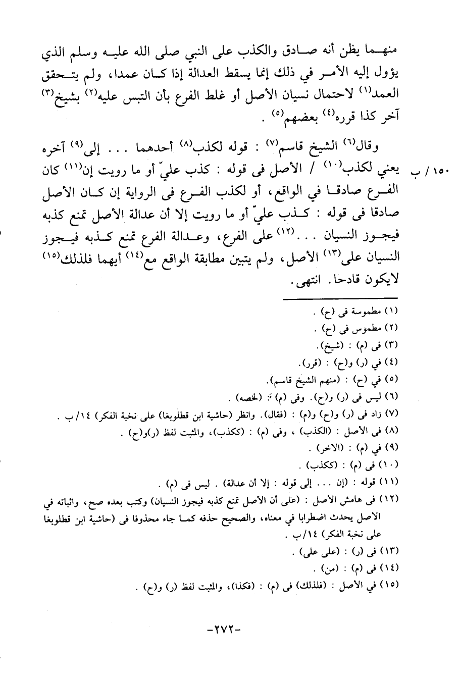 وَقَالَ الشَّيْخ قَاسم: قَوْله لكذب أَحدهمَا. . إِلَى آخِره يَعْنِي لكذب / الأَصْل فِي قَوْله: كذب عَليّ أَو مَا رويت إِن كَانَ الْفَرْع صَادِقا فِي الْوَاقِع، أَو لكذب الْفَرْع فِي الرِّوَايَة إِن كَانَ الأَصْل صَادِقا فِي قَوْله: كذب عَليّ أَو مَا رويت إِلَّا أَن عَدَالَة الأَصْل تمنع كذبه فَيجوز النسْيَان. . على الْفَرْع، وعدالة الْفَرْع تمنع كذبه فَيجوز النسْيَان على الأَصْل، وَلم يتَبَيَّن مُطَابقَة الْوَاقِع مَعَ أَيهمَا فَلذَلِك لَا يكون قادحا. انْتهى.