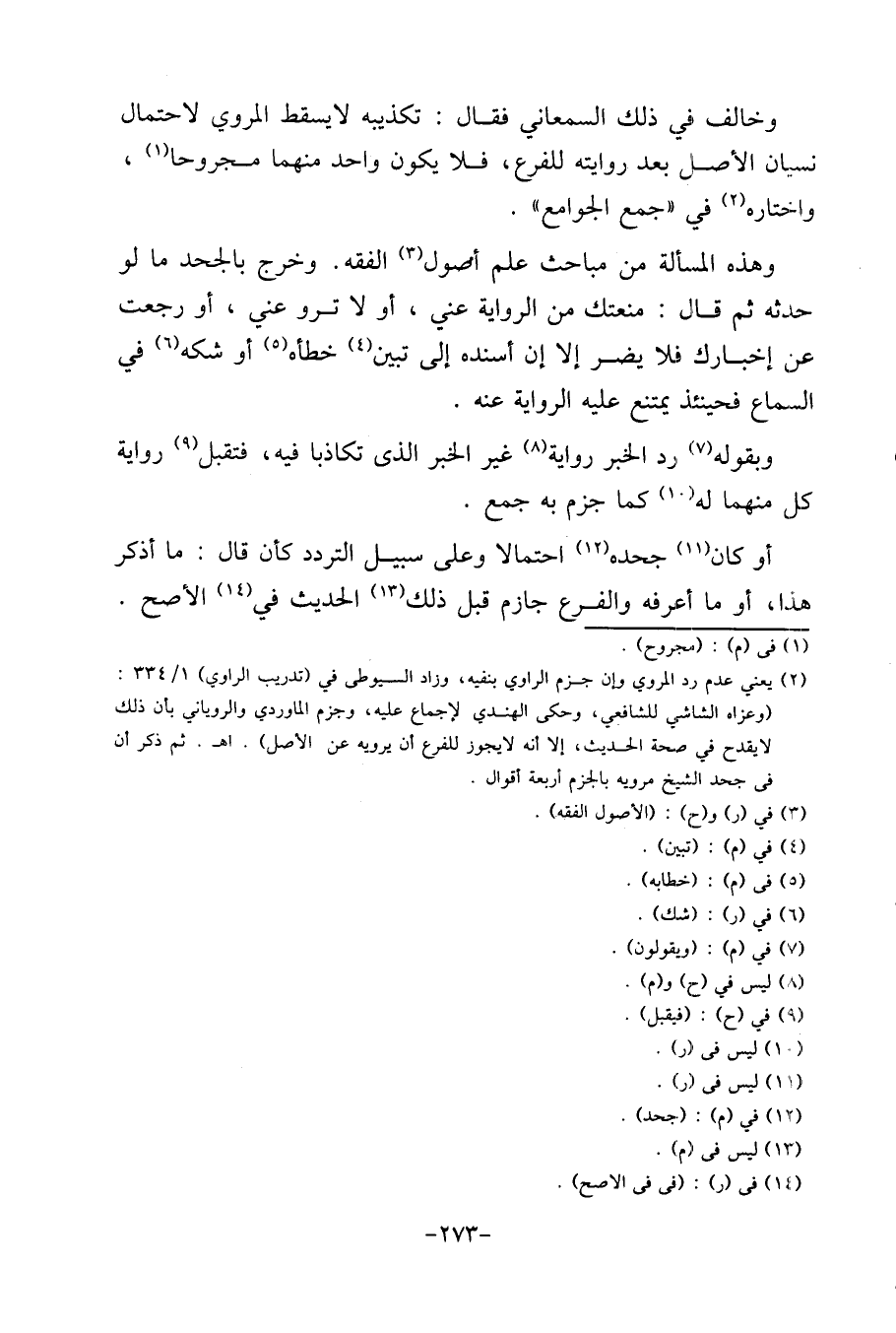 وَهَذِه الْمَسْأَلَة من مبَاحث علم أصُول الْفِقْه. وَخرج بالجحد مَا لَو حَدثهُ ثمَّ قَالَ: منعتك من الرِّوَايَة عني، أَو لَا ترو عني، أَو رجعت عَن إخبارك فَلَا يضر إِلَّا إِن أسْندهُ إِلَى تبين خطأه أَو شكه فِي السماع فَحِينَئِذٍ يمْتَنع عَلَيْهِ الرِّوَايَة عَنهُ.