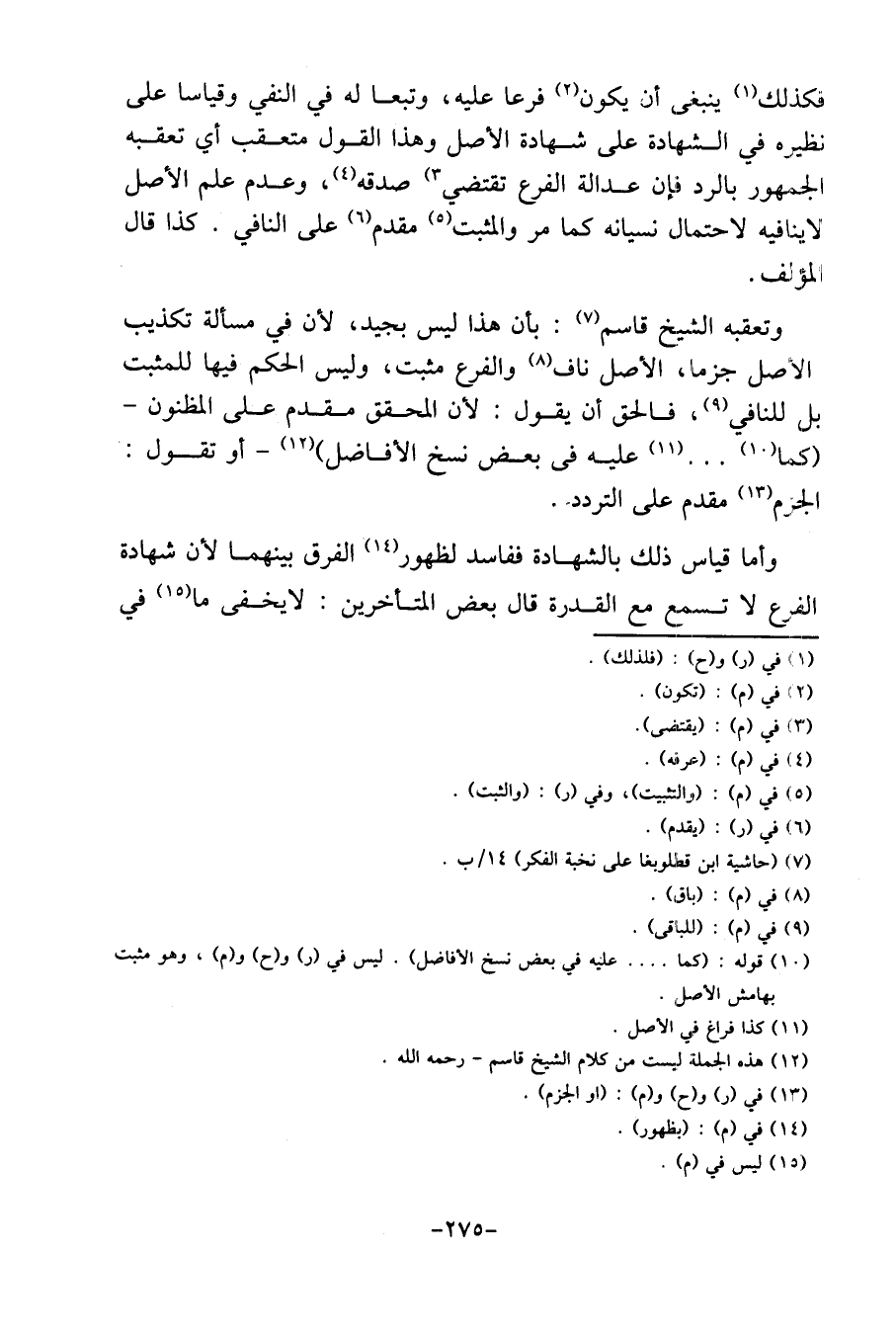 وَتعقبه الشَّيْخ قَاسم: بِأَن هَذَا لَيْسَ بجيد، لِأَن فِي مَسْأَلَة تَكْذِيب الأَصْل جزما، الأَصْل ناف وَالْفرع مُثبت، وَلَيْسَ الحكم فِيهَا للمثبت بل للنافي، فَالْحق أَن يَقُول: لِأَن الْمُحَقق مقدم على المظنون - كَمَا. . عَلَيْهِ فِي بعض نسخ الأفاضل) - أَو تَقول: الْجَزْم مقدم على التَّرَدُّد. وَأما قِيَاس ذَلِك بِالشَّهَادَةِ ففاسد لظُهُور الْفرق بَينهمَا لِأَن شَهَادَة الْفَرْع لَا تسمع مَعَ الْقُدْرَة قَالَ بعض الْمُتَأَخِّرين: لَا يخفى مَا فِي