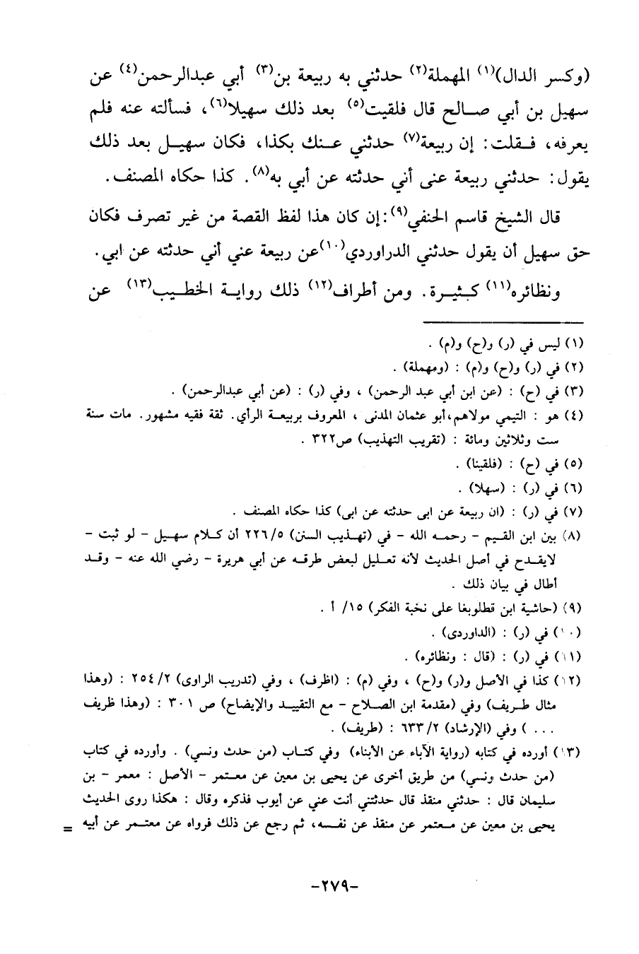 (وَكسر الدَّال) الْمُهْملَة حَدثنِي بِهِ ربيعَة بن أبي عبد الرَّحْمَن عَن سُهَيْل بن أبي صَالح قَالَ فَلَقِيت بعد ذَلِك سهيلا، فَسَأَلته عَنهُ فَلم يعرفهُ، فَقلت: إِن ربيعَة حَدثنِي عَنْك بِكَذَا، فَكَانَ سُهَيْل بعد ذَلِك يَقُول: حَدثنِي ربيعَة عَنى أَنِّي حدثته عَن أبي بِهِ. كَذَا حَكَاهُ المُصَنّف.